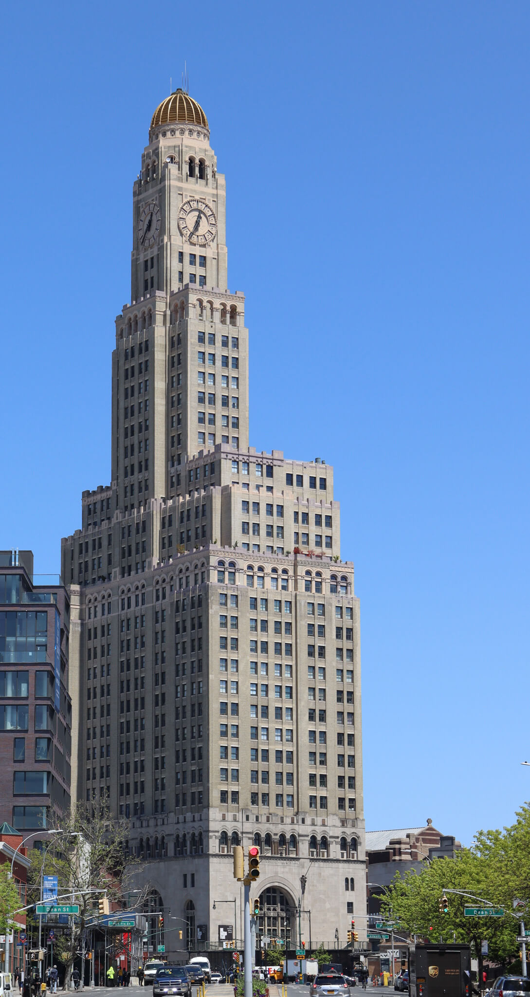 Completed in 1929, the Williamsburgh Savings Bank stood as the tallest building in Brooklyn for 80 years. It served as the headquarters of the bank and leased many of the upper floors to dentists. It’s now luxury condos and an event space, but that wasn’t the case when my father worked here and I occasionally accompanied him to his job. This art deco skyscraper, which incorporated Byzantine and Romanesque styles, could be seen for miles, long before downtown Brooklyn surged into hyper-development, reflecting the original urban plan for more skyscrapers here when this building arose, a plan that died with the onset of the Great Depression. The first six stories of the tower are clad with limestone and feature three round-arched doorways and three 40’-tall windows, flanked by smaller arched windows. The window frames are ornately decorated, with half-round mullions. It’s fun to hunt for the other carved details here—beehives; squirrels storing nuts; the head of Mercury, god of commerce; wise owls; seated lions whose paws protect the bank’s lockbox; and a burglar trying to break in. Four continents are represented in the windows’ carved grilles. Buff brick and terracotta details are used to visually separate the base from the setback upper section that rises up to the topmost square section of the building, which sports large clock faces on each side on the 30th through 32nd floors. With faces measuring 27’ across, these were the largest clocks in New York and ranked among the largest in the world. At the very top, an octagonal drum supports a gilded dome.