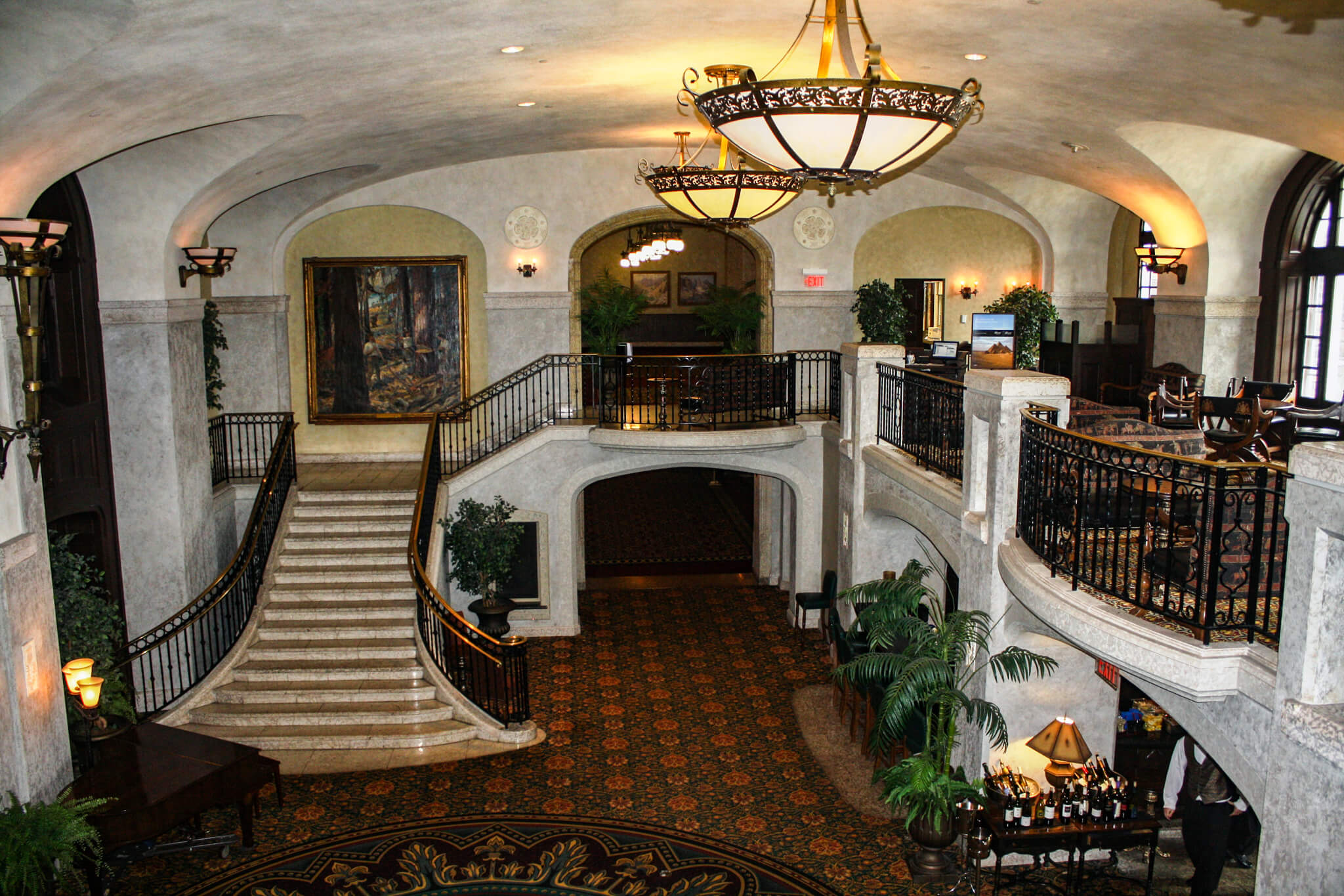 Eventually, I stepped into the cavernous lobby, with its Rundlestone columns, high vaulted ceiling, a couple of massive stone stairways, and period lighting, including what could pass for medieval candle chandeliers. Handmade carpets embroidered with the Latin Semper Eadem (Always the Same) cover sections of the limestone floor. I contemplated that as I wandered around the public areas, thinking that not everything here is the same; it couldn’t possibly be, given its century-old history, including the 1942–45 period, when the hotel was shut down and silenced completely in order to free up labor for the war effort. I was sure that the elegance and service, however, had not been altered.