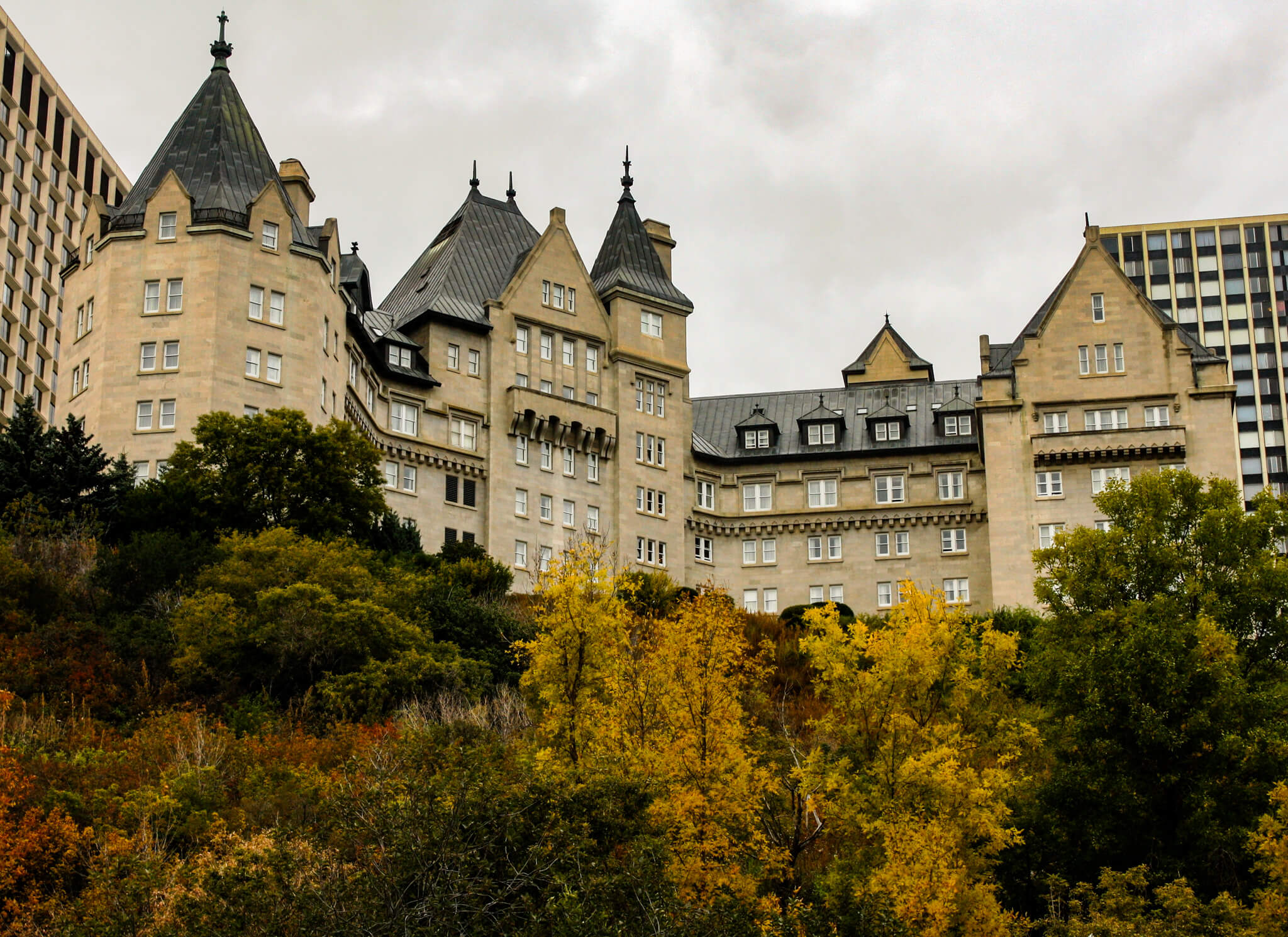 My first glimpse of Hotel Macdonald came from far below, as I was walking through the park that runs along the banks of the North Saskatchewan River. Above me, on a bluff overlooking the river, the hotel rises like a imposing Renaissance-style chateau in the French countryside. To get a closer view, I scaled the Hotel Macdonald Stairs in an ambitiously aerobic endeavor—just over 200 wooden steps from the river up to the hotel. Built as one of the Grand Trunk Pacific Railway’s majestic hotels in 1915 in an area that was a squatters camp of Ukrainian-speaking migrants, the Macdonald cost a whopping C$2.25 million to build. Named after Canada’s first prime minister, the hotel has had a shaky history, starting with the Grand Trunk declaring bankruptcy only four years after opening the hotel. It subsequently operated under the Canadian National Railway umbrella. It lost its liquor license during prohibition but regained it in 1924. A massive expansion after World War II added nearly 300 rooms, but that was a short-lived endeavor: CNR closed the entire hotel in 1983 and tore down the extension altogether. Plans to create a new addition, complete with two office towers, never came to fruition, and the entire hotel was threatened with demolition until the City of Edmonton designated it a municipal heritage resource the following year. Shortly after that, another tremendous renovation was completed in 1991, and today it’s a spectacular sight. The limestone behemoth boasts balustrades, balconettes, brackets, and turrets. The main entrance is placed diagonally on the building, with a portico with five arches, gargoyles, and the crests of four western Canadian provinces. The pitched copper roof features dormer windows, finials, and multiple chimneys. Inside, guests in the nearly 200 rooms and suites can enjoy a variety of dining venues, a health club, and the restored elegance of the Wedgwood Room (named after the Wedgwood detailing on the ceiling), the Empire Ballroom (with a 21’ ceiling adorned with bas relief carvings), and the Confederation Lounge and its fireplace. It’s easy to see why King George VI and Queen Elizabeth chose to stay here in 1939.