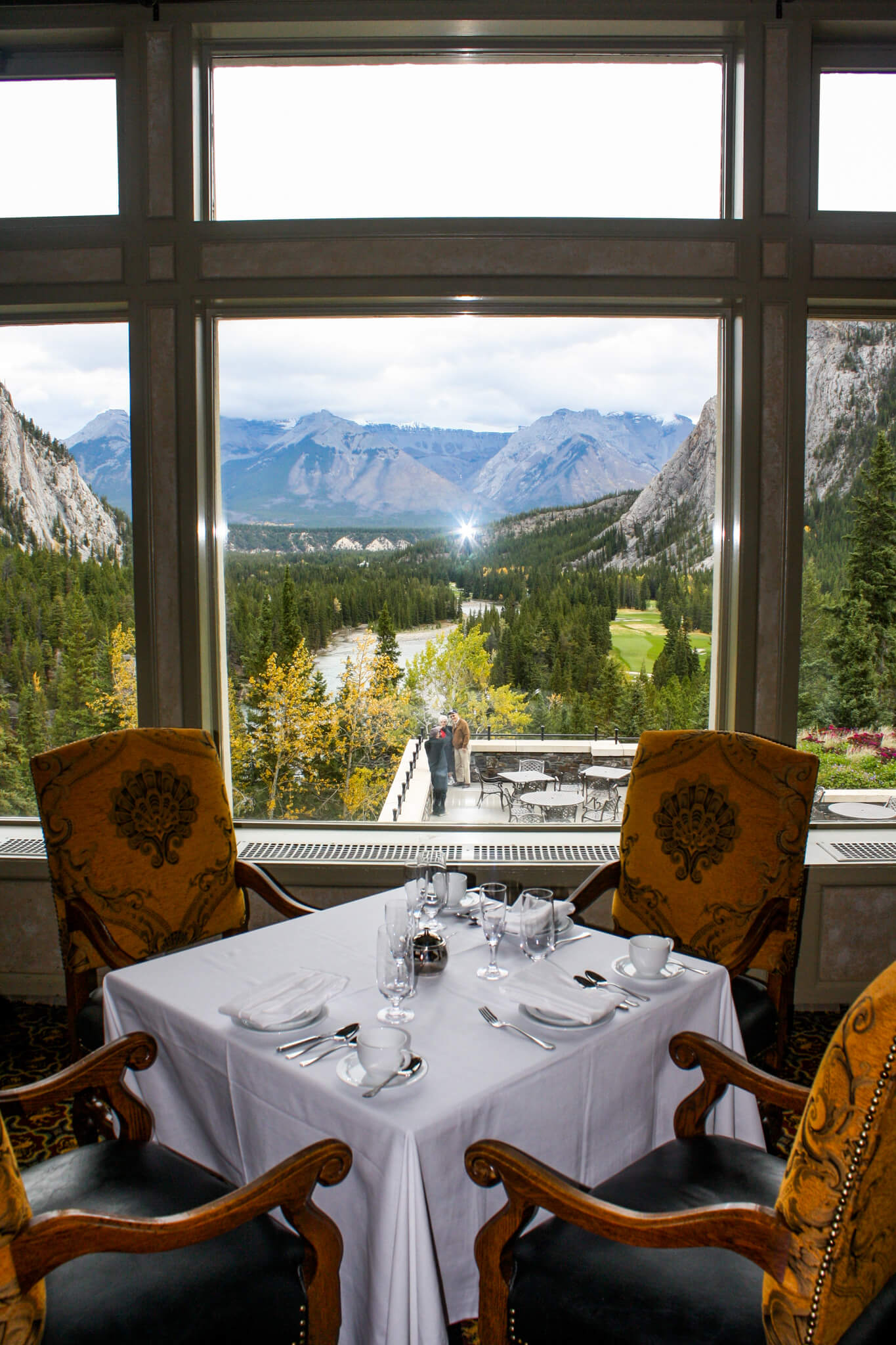 As I pried further into the hotel, I admired the profusion of oak paneling, stained glass, decorative plasterwork, marble fountains, cast-bronze doors, and fossil-rich stone window ledges. The dazzling two-story Mount Stephen Hall, inspired by 15th-century Gothic architecture, is embellished with grilled balconies, a cloistered walkway, carved oak ceiling beams, and leaded-glass windows. And the sumptuous Rundle Hall, with an open mezzanine level, grand staircase, vaulted ceiling, and deep-set windows, is the perfect setting for a bit of relaxation. In quieter parts of the hotel, I moseyed down the hallway with coffered ceilings to the silent baby grand piano, stopping along the way at the fireplace that looks as if it were stolen from a 15th-century castle, and the more modest one topped with a glazed panel of a Spanish galleon at full sail. I ended my exploration on one of the terraces, soaking in the sweeping views of mountains, trees, rivers, and the golf course. Being a visitor here is unforgettable, but I imagine being an overnight guest staying in one of the 757 rooms and suites (and dining in the 10 venues) is even better—but you will have to pay a bit more than the $3.50 nightly rate that was charged when the hotel first opened.