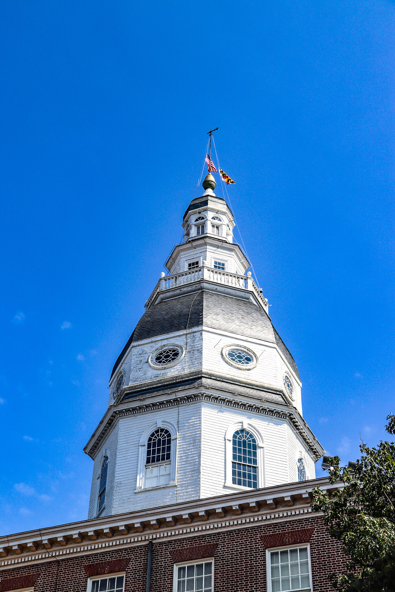 A walk through the Maryland State House is a walk through history. I approached this National Historic Landmark (1960) via a broad plaza flanked by Federal buildings, including the governor’s house. Occupying a hilltop traffic circle from which radiate at least half a dozen streets, Maryland’s capitol is the oldest state capitol in the United States still in continuous use, begun in 1772 and completed in 1797 after a long delay stemming from that disruptive Revolutionary War. It’s also the only state capitol to have ever served as the national capitol, albeit very briefly (1783–84). The Georgian-style building is a vertical treat. A long flight of stairs leads up to the portico with six Corinthian columns supporting a pediment with dentils and a sculpted state seal. Above that, a long balustrade spans the entire peak of the roof, and above that rises the largest wooden dome in the United States, constructed without nails and resting on an octagonal drum with lozenge-shaped windows. Look to the very top to find the lantern capped by a lightning rod that was constructed and grounded according to Benjamin Franklin’s specifications.