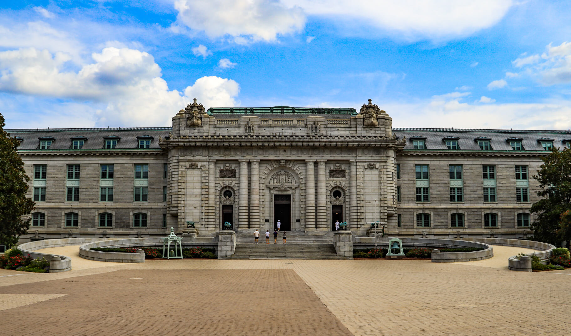 Do you remember what your college dorm looked like? Mine was an uninspired, and uninspiring, two-story brick box that had the personality of a discarded cigarette butt. The midshipmen at the U.S. Naval Academy, however—all 4,000 of them—get to live in what is widely regarded as the largest contiguous set of academic dormitories in the United States. Named for former Secretary of the Navy George Bancroft, this massive Beaux-Arts building (another Ernest Flagg beauty) was completed in 1906 and was enlarged in 1917, 1939, and 1961. It’s so large that it has its own ZIP code. It contains 1,700 rooms, nearly five miles of corridors, and 33 acres of floor space. It also houses everything its residents would need on a daily basis—barbershop; laundromat; bank; travel office; cafeteria and small restaurant; medical, dental, optometry, and orthopedics clinics; gym; and book, general, uniform, and cobbler shops. Renovations in 2003 added 1,600 miles of wiring for the building’s data communication network, and, just as importantly, air conditioning.