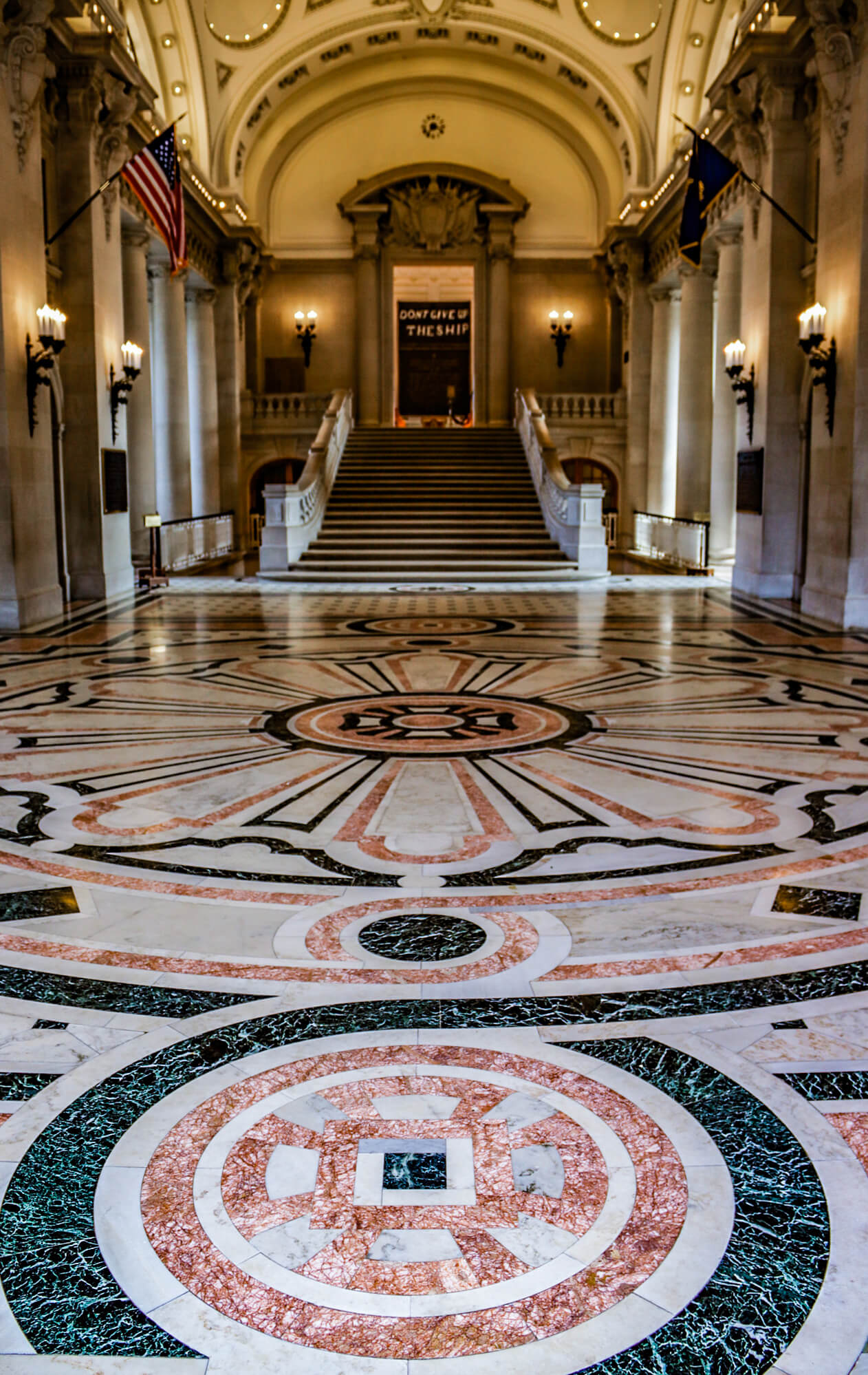 From top to bottom, the rotunda is guaranteed to wow you: gorgeous ceiling, fine pilasters, marble floor, and a mural of the USS South Dakota during the Battle of the Santa Cruz Islands in World War II painted into a lunette. I advanced toward the large staircase and climbed up to Memorial Hall. This tremendous room honors Naval Academy alumni who died in combat or military operations during their service to their country—more than 2,660 lost souls, identified by name and class year on the hall’s walls, starting in 1846. Another panel lists the names and class years of nearly one thousand alumni killed in action and the name of the war that claimed their lives. Tremendous chandeliers hang from the ceiling skylight that contains 489 panes of glass. Murals of key American ships and battles, like the Constitution and the Battle of Lake Erie, fill in the lunettes at the base of the curved ceiling. Surrounded by such beauty and thoughtfulness, it’s easy to understand the “don’t give up the ship” mentality and dedication instilled here, especially with Captain James Lawrence’s dying words, uttered on USS Chesapeake during the War of 1812, prominently displayed here.
