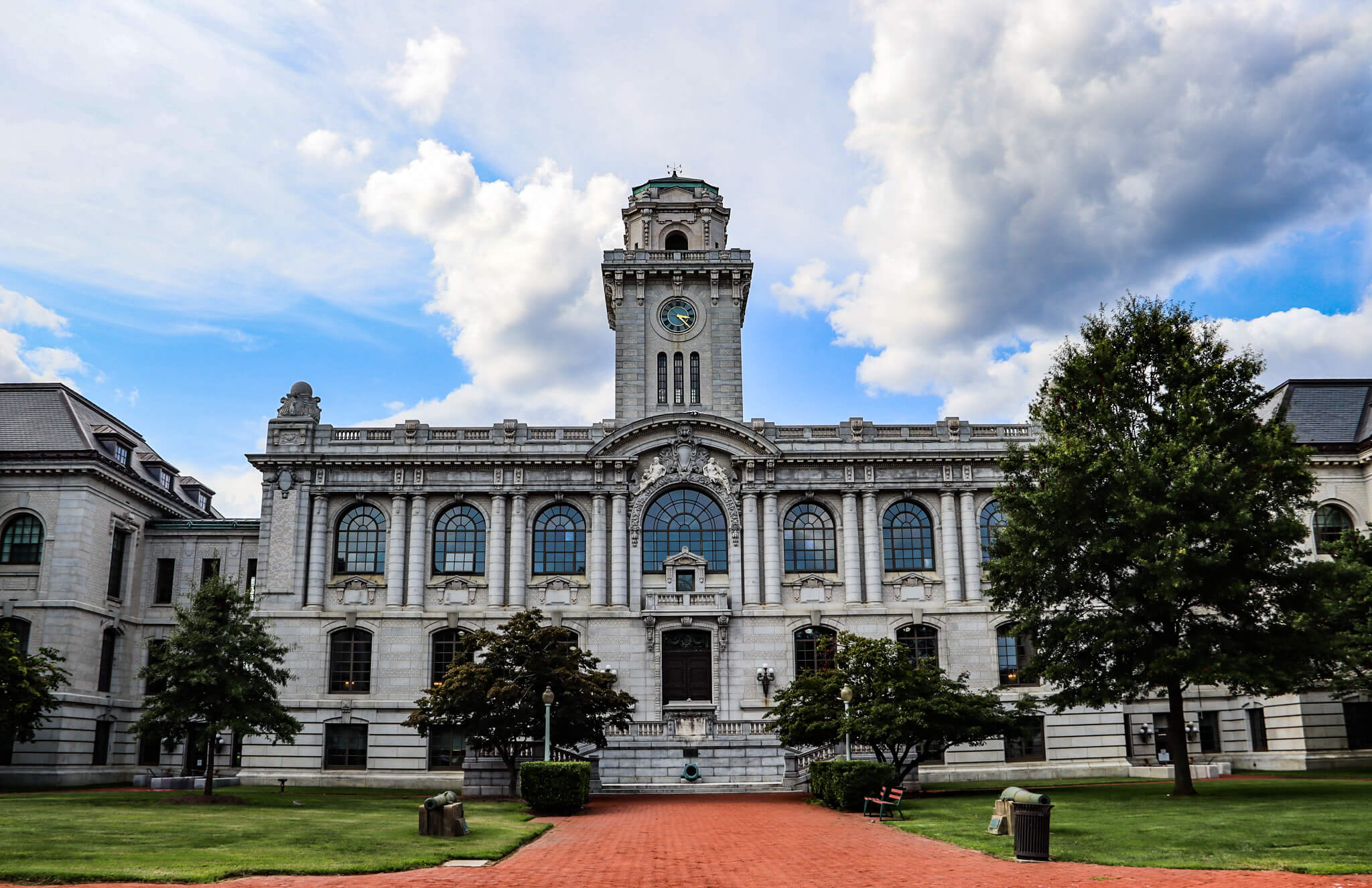 Ernest Flagg struck gold again with the centerpiece of the original academic group around the Naval Academy’s main quadrangle, The Yard. On the opposite side of The Yard from Bancroft Hall and anchoring one end of Stribling Walk, Mahan Hall was constructed in 1902 as a classroom building. In addition, it housed a library, auditorium, and a huge reading room, articulated by the large arched windows on the second floor. This Beaux-Arts building of gray brick and terra cotta features two three-story hyphens connecting the two classroom wings with the grand central section. The main entrance rises above grade, approached via a double staircase, anchored by a verdigris-green 17” mortar captured at Manila during the Spanish American War. (And that’s not the only booty; inside, you’ll find the only British royal standard taken by capture, at Toronto during the War of 1812.) Pairs of round columns support the cornice, and two creamy-white allegorical figures, one male and one female, lounge above the central window. Above, the roofline is a glorious riot of architectural details—festoons and balustrades and brackets. From all this rises the hall’s signature clock tower. Each side includes a trio of long, slender arched windows with panes of gradating shades of blue and purple, a simple clock face with golden hands, and four brackets supporting the walkaround at the top of the tower, itself capped by a simple weather vane. The building was named for Rear Admiral Alfred Thayer Mahan, Class of 1859—and there’s no doubt he would be proud of his namesake.