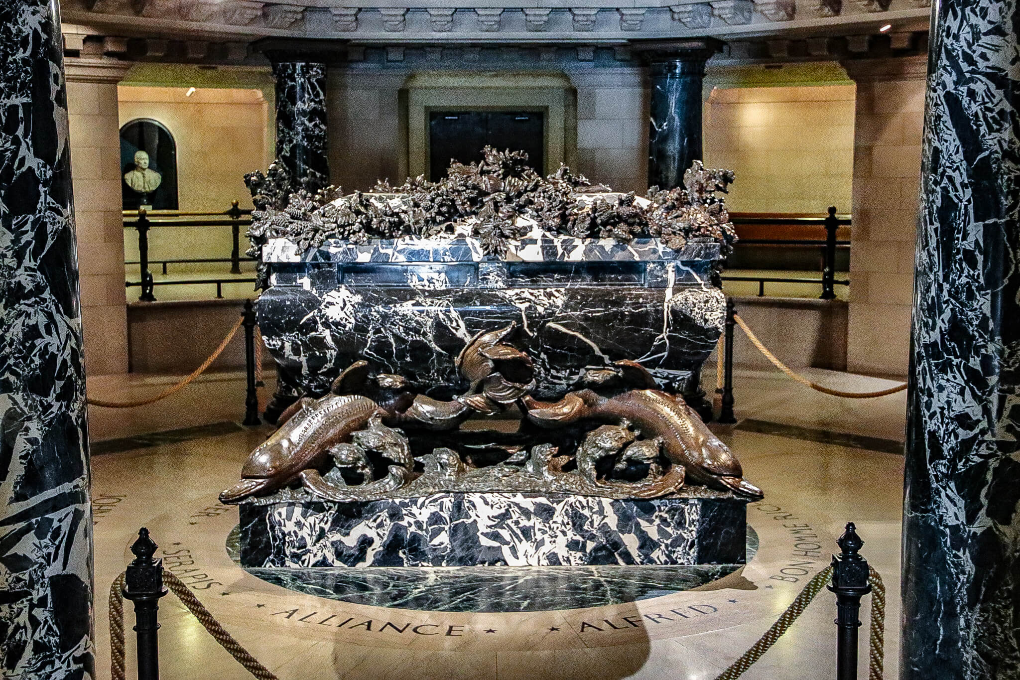 I finished my visit by heading downstairs into the crypt to see one of the chapel’s greatest treasures. In this eerily silent space, I found, in the center of a circular deck surrounded by a series of columns, an extravagantly embellished sarcophagus—a 21-ton frenzy of black and white Italian marble, bronze fittings, and dolphins amid waves. The names of six ships are inscribed in the floor circling around the casket: Bonhomme Richard, Alliance, Serapis, Ariel, Alfred, Providence, and Ranger. It all seemed highly appropriate for the United States’ first naval commander to achieve renown, John Paul Jones, who, in a bizarre career path following the American Revolutionary War, found himself serving the Imperial Russian Navy under Empress Catherine II. Jones was only 45 when he died in Paris in 1792 and was buried there, in a cemetery that belonged to the French royal family. Four years later, the French revolutionary government sold the property, and the cemetery and Jones were forgotten. More than a century later, the U.S. ambassador to France identified Jones’ remains after a six-year search. In 1906, the remains were returned to Jones’ adopted country (he was born in Scotland) that he helped achieve independence and finally, in 1913, he received the grand final resting place he deserved.