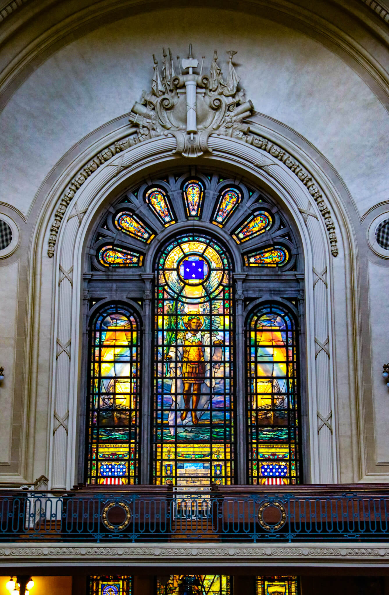 Two huge columns flank the main entrance. I passed through the open doors, a pair of 22’ bronze-cast monoliths with “Father Science” and “Mother Patriotism” sculpted into their panels, dedicated in 1909. Right from the start, the chapel’s sheer size is almost overwhelming. Rows of pews and parallel upper-level balconies under the windows march up to the altar area, drawing me closer to the rich blues and yellows of the stained glass behind the altar. The pulpit, installed in 1943, bears ornately carved figures of the four gospel writers. Above, the dome’s oculus spans a diameter of 20’. The ribs of the dome curve down to a series of 24 busts on plinths, representing the races of mankind, including a Native American chief, a Greek warrior, and the Statue of Liberty.