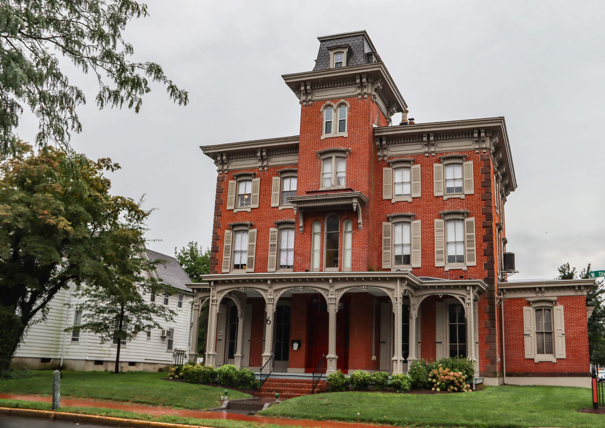 If you have a good imagination, and are at a certain age in life, the Italianate-style Dr. Henry Ridgely House looks like it’s straight out of a spooky episode of Scooby-Doo, especially when it’s illuminated at night. If not, then it’s simply a truly remarkable building, built in 1869 as a residence and physician’s office. Ridgely was 57 years old when his home was constructed, complete with offices and waiting and examining rooms on the first floor. The three-story house is clad in brick, with stone quoins. The square five-story central tower features paired consoles supporting a cornice with dentils and a windowed mansard roof with fish-scale shingles. The wonderful wooden front porch boasts arched openings between box columns and fan brackets. Most of the round- and segmental-arched windows with bracketed hoods feature shutters. There are two wooden bays on the north side, one with stained-glass upper windows, and a bay window on the south side. It’s a glorious structure, now serving as offices for a law firm.