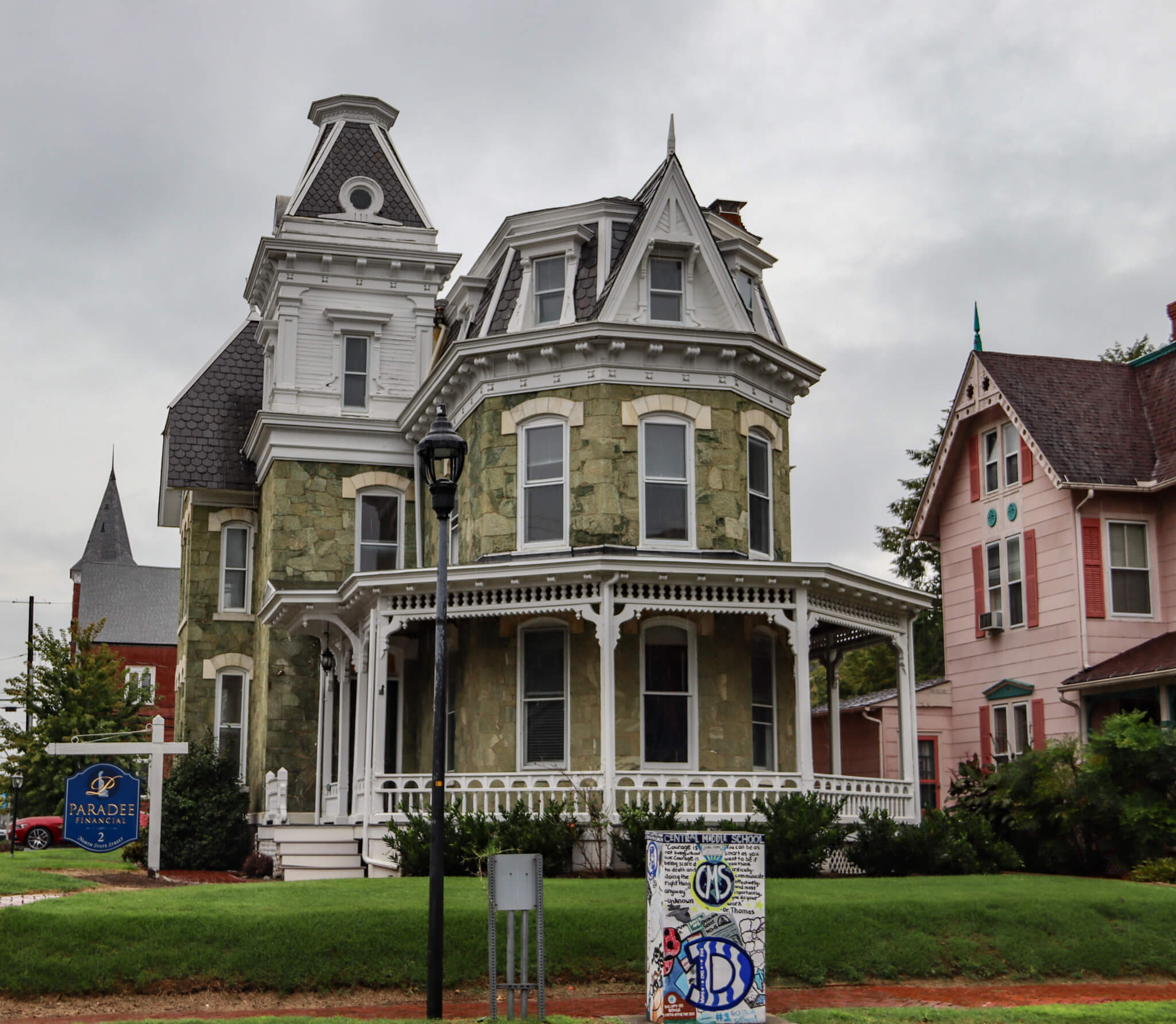 Directly across the street from the Dr. Henry Ridgely House stands another beauty, the Mifflin House, completed in 1885. By now, I was hardly surprised that it was built for a canner magnate, this time a canner of peaches. Indeed, the Delmarva Peninsula, including Dover, was the center of the canned-food industry in the United States for a century, starting in the 1840s. By 1919, there were 111 canneries in Delaware alone, employing more than 1,800 people. The Mifflin House was built with brick, in the rear, but the bulk of it employs serpentine stone, a greenish gemstone that was popular as a building material around this era, valued for its color but ultimately phased out due to its porous nature that contributed to its own deterioration as water that was absorbed repeatedly froze and thawed, compromising the structural integrity. Listed on the National Register of Historic Places, the two-and-a-half story building features lots of fanciful wood trim painted white, a wrap-around front porch, a mansard roof with gray fish-scale shingles, a tower with ocular windows, and a curved stone staircase at its corner leading to a brick pathway up to the house. Like the other buildings on my list, the Mifflin House has been converted to something else: offices for a financial services company.