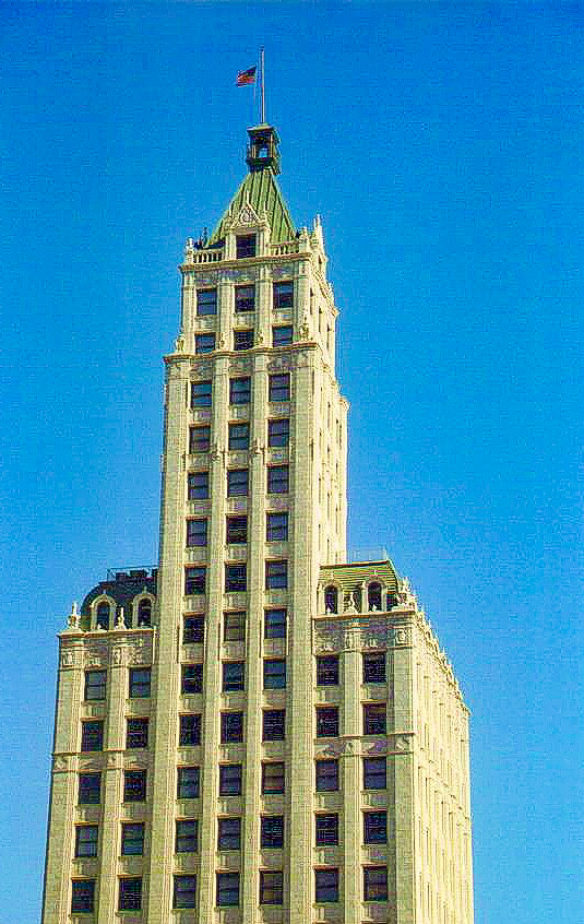 For a split second, I thought I was back in New York, and I had to jump out of the way of an oncoming trolley car before I could assure myself that I was still in Tennessee. The 22-story Lincoln American Tower, the 10th tallest building in Memphis, looks strikingly like the Woolworth Building in downtown Manhattan. And, as I soon discovered, that was a deliberate design choice. Erected on the site of a Civil War prison by the president of the Memphis branch of the Columbia Mutual Insurance Company (precursor of the Lincoln American Insurance Company), the building was christened the Columbia Mutual Tower when it was completed in 1924, about 11 years after the Woolworth Building. The gleaming-white tower is a replica of Woolworth, but at only one-third its size. Although the two buildings, at first, look like twins of different heights, closer inspection reveals some differences. Both have exteriors covered in white terra-cotta glaze, verdigris-green mansard roofs about halfway up, a central tower with a pyramidal cap with a lantern, strong vertical piers, highly ornamented cornices around the building, and decorative bas-reliefs. Woolworth’s ornamentations are more intricate, and it presents a much stronger Gothic style, but you can’t look at one without thinking of the other. One of the first steel-frame skyscrapers in Memphis, the tower—on the National Register of Historic Places since 1978—is now a mixed-use building, with residential apartments, commercial offices, and ground-floor retail space.