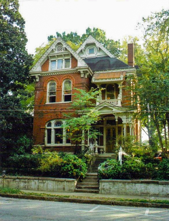 Not everyone receives a beautiful house as their wedding present, but the lucky Mollie Fontaine did, back in 1886, when she married Dr. William Taylor on Valentine’s Day and her father—a merchant, financier, and president of the world’s third-largest cotton company—presented his gift. Located across the street from the James Lee House in Victorian Village, the house was built in the Eclectic Revival style, with Victorian and Queen Anne touches. A staircase breaks up the retaining wall along the sidewalk and leads up to the main entrance, a small porch underneath the romantic second-floor balcony. The red-brick façade features an arch, with a face keystone, above the three ground-floor windows. Brackets and dentils define the roofline, with a double gable. Mollie lived here until her death in 1939. Neglected and occupied by transients after that (the stained-glass windows were stolen), it was saved from the wrecking ball in the 1960s by a local Memphian who sold it a short time later. The new owner turned it into a party palace, with shag carpeting and mirrors on the ceilings. In turn, he sold it to a lighting director in 1985, who turned the carriage house for horses into a recording studio, and whose wife relocated her catering business here, followed by a restaurant that opened in 1996, with Francis Ford Coppola in attendance for the grand opening. In 2007, the restaurant morphed into a lounge that, ultimately, closed a little over a year ago. Although I couldn’t gain access to see the framed doorways inside, the wonderful banisters, and the other treasures of a bygone era, I was still pleased to see yet another survivor along Memphis’ former Millionaire’s Row.