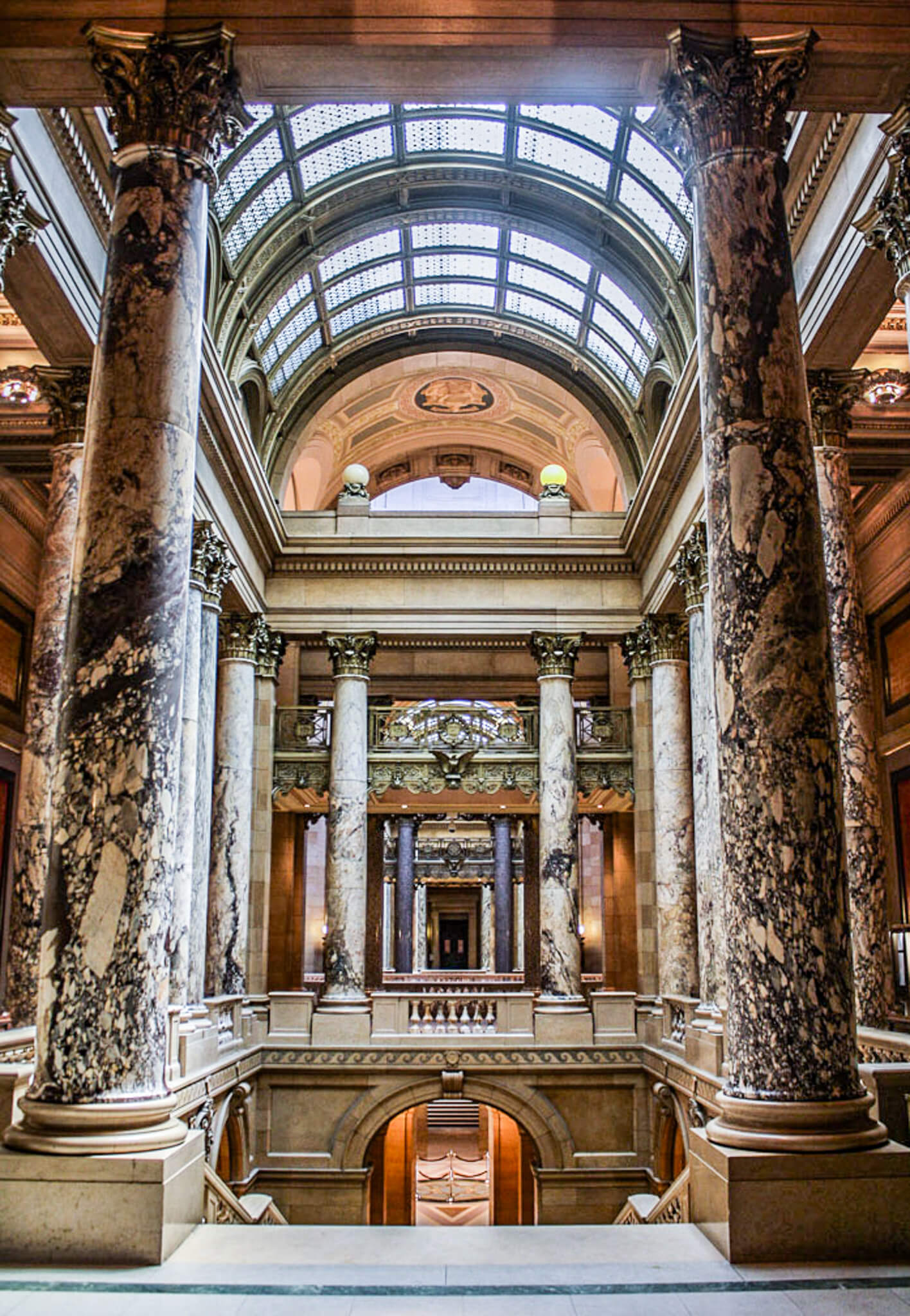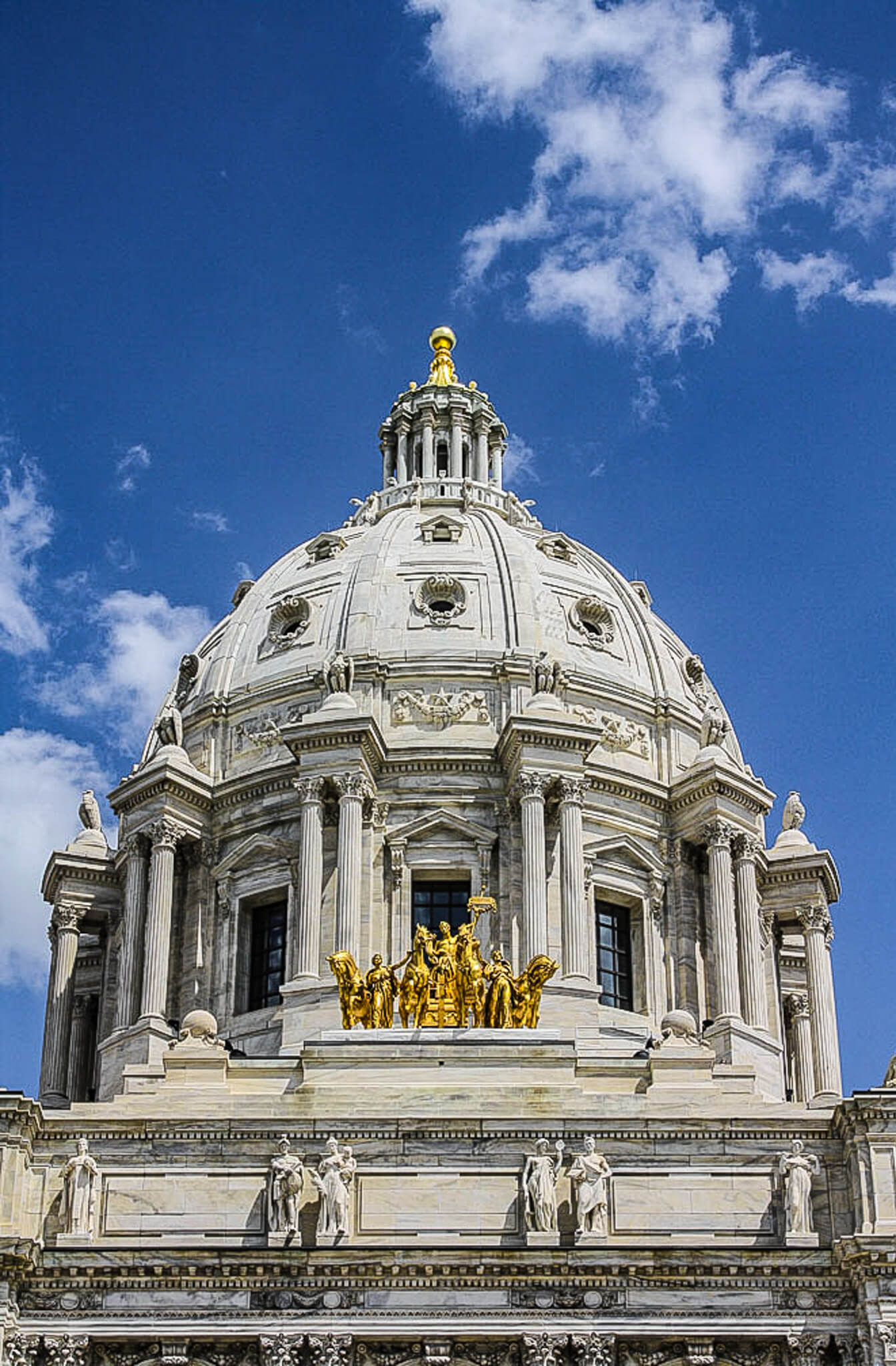 The incomparable and prolific architect (and one of my favorites) Cass Gilbert produced three U.S. capitols during his career. The Minnesota State Capitol was his first (those for Arkansas and West Virginia would follow later on). Opened in 1905 after nine years of construction and at a cost of $4.5 million, the granite and white-marble capitol, and especially its impressive dome, is visible from many parts of the city. After a fire destroyed the first capitol and the second one was razed, Gilbert created this Beaux Arts / American Renaissance masterpiece, beating out more than 40 other submissions. Its numbers are impressive: 430’ in length, 220’ high, and more than 300,000 square feet of floor space, and its beauty and architectural and historical significance earned it a spot on the National Register of Historic Places in 1972. The marble and granite exterior (look for the Viking ship, in a nod to the state’s large Scandinavian population) is enlivened by carvings, arched windows, plaques, and classical wreaths. Six heroic-sized statues representing a half dozen virtues—Bounty, Courage, Integrity, Prudence, Truth, and Wisdom—greet visitors above the main entrance. Above them, Progress of the State, a copper and steel quadriga covered in glittering gold leaf, depicts Christopher Columbus standing in a four-horse chariot guided by two maidens carrying staffs of victory. It rests at the bottom of the drum of the spectacular dome, ringed by Corinthian columns and a dozen eagles. The dome itself is the second-largest self-supported marble dome in the world, behind only the one that inspired Gilbert—the Basilica of St. Peter in Vatican City. It’s topped by a columned stone lantern capped by a finial globe covered in gold leaf.
