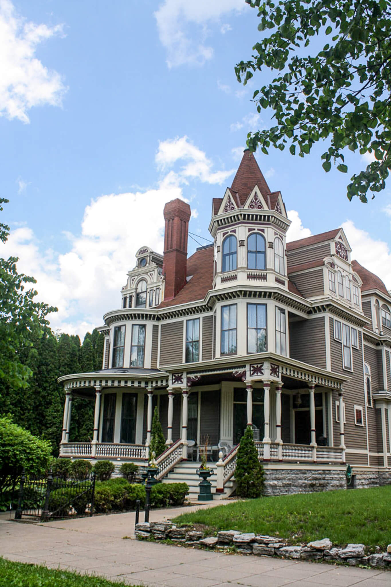 Another Summit Avenue knockout, Driscoll-Weyerhaeuser House derives its name from the original owner, newspaper magnate Frederick Driscoll, who had it built for $25,000 in 1884, and lumber baron Frederick Weyerhaeuser, who purchased it in 1900 when Driscoll moved to Chicago and whose eponymous company is still thriving as a multi-billion-dollar business. The Queen Anne–style red-brick mansion with stone decoration features dormers, an eyebrow window, porches, eaves with pronounced brackets, and a three-story tower capped by a conical hat. It has seen some changes over the years in both its design—the front porch was removed in 1910 and replaced by a stone entrance, and a porte-cochère was added later on—and its uses, including serving as the headquarters for the Indianhead Council of the Boy Scouts of America, a nunnery for French nuns, an ill-fated hotel, part of a college, and a bastardized multifamily home before reverting to a single-family home. I considered, with envy, the good fortune of the owners of the 11,000-square-foot home with six bedrooms, 8.5 bathrooms, home theater, wine cellar, and a spacious entry foyer with a fireplace, marble black-and-white checkerboard floor, stunning grand staircase, and beamed ceilings. Good for them for restoring this regal home that remains one of St. Paul’s finest residences.