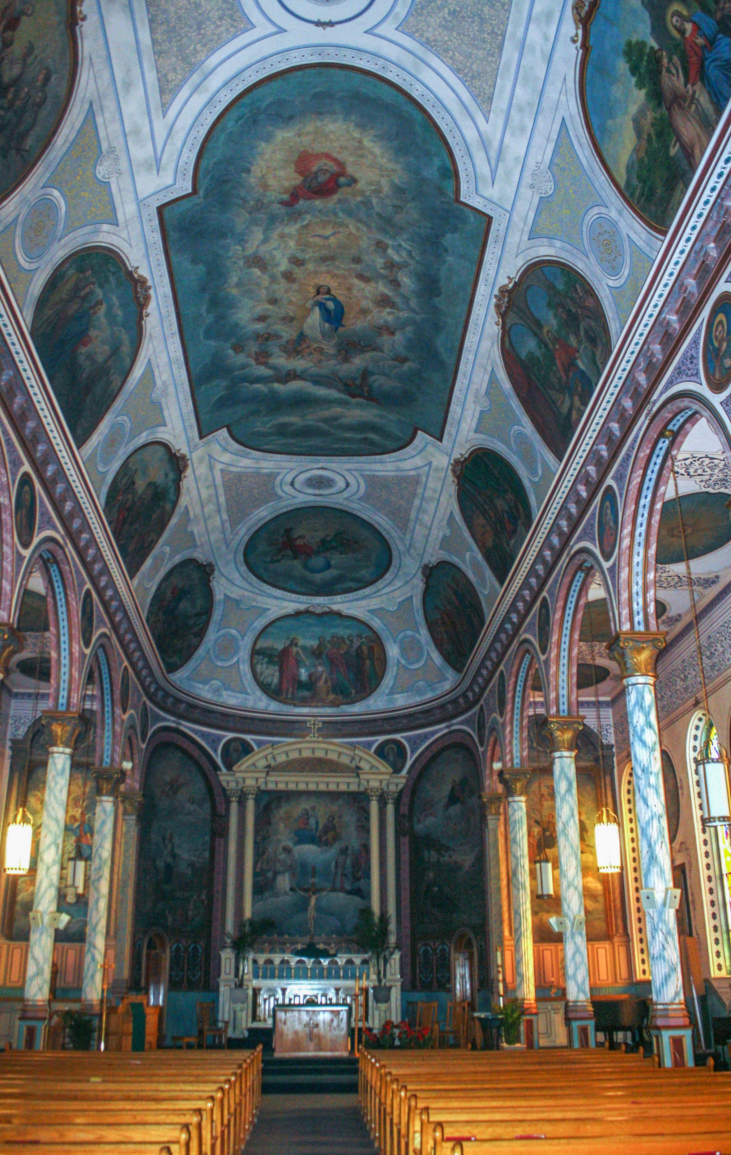 Since it opened in 1892, St. Francis Xavier has stood as the tallest church in Missoula and one of the tallest in Montana. This Jesuit church was constructed in the Romanesque Revival style, with semicircular arches over the doors and windows, smaller arches along the eave line, small buttresses, and a tower that holds a 2,270-lb. bell. Overall, it’s a fairly subtle building, but once I stepped inside, my impressions changed. The cruciform plan was designed to hold 150 worshippers in the choir loft and 600 more sitting in the nave under a barrel vault and the two side aisles, defined by parallel arcades with a cornice that runs in an unbroken line around the semicircular apse, unifying the sanctuary area with the rest of the church. The original organ, added in 1904, contains about 1,800 pipes, the visible ones repainted in turquoise when it was restored in 1965, complementing the turquoise on the columns below. The artwork is even more striking. Stained-glass windows, donated by pioneers, cast the interior in a golden glow on sunny days. These windows were added in the very early 1900s, replacing the original ordinary glass windows in attempt to guard the church’s most notable feature from damaging sunlight—the 14 Stations of the Cross and 66 frescoes, all painted by one man, Brother Joseph Carignano of the Society of Jesus. Over the course of 18 months during 1901 and 1902, Carignano, a native of Turin, Italy, expended great effort in painting the murals as graphic depictions of Christian belief on the church’s ceiling and pale rose walls, creating a harmonious and visual catechism and featuring scripture stories, the symbols of the liturgy, and saints following Jesus’ example. He chose vibrant colors to counter the grayness of Montana winters, and his fine work, inspired by early Renaissance Italy, balanced the rugged lives of the early pioneers here. When Carignano died in 1919, his obituary included a Biblical quote from Hebrews 11:4: “he being dead yet speaketh,” appropriate for the ongoing life of his art, made even more astounding by the fact that he was an untrained artist who worked as a cook in a nearby mission.