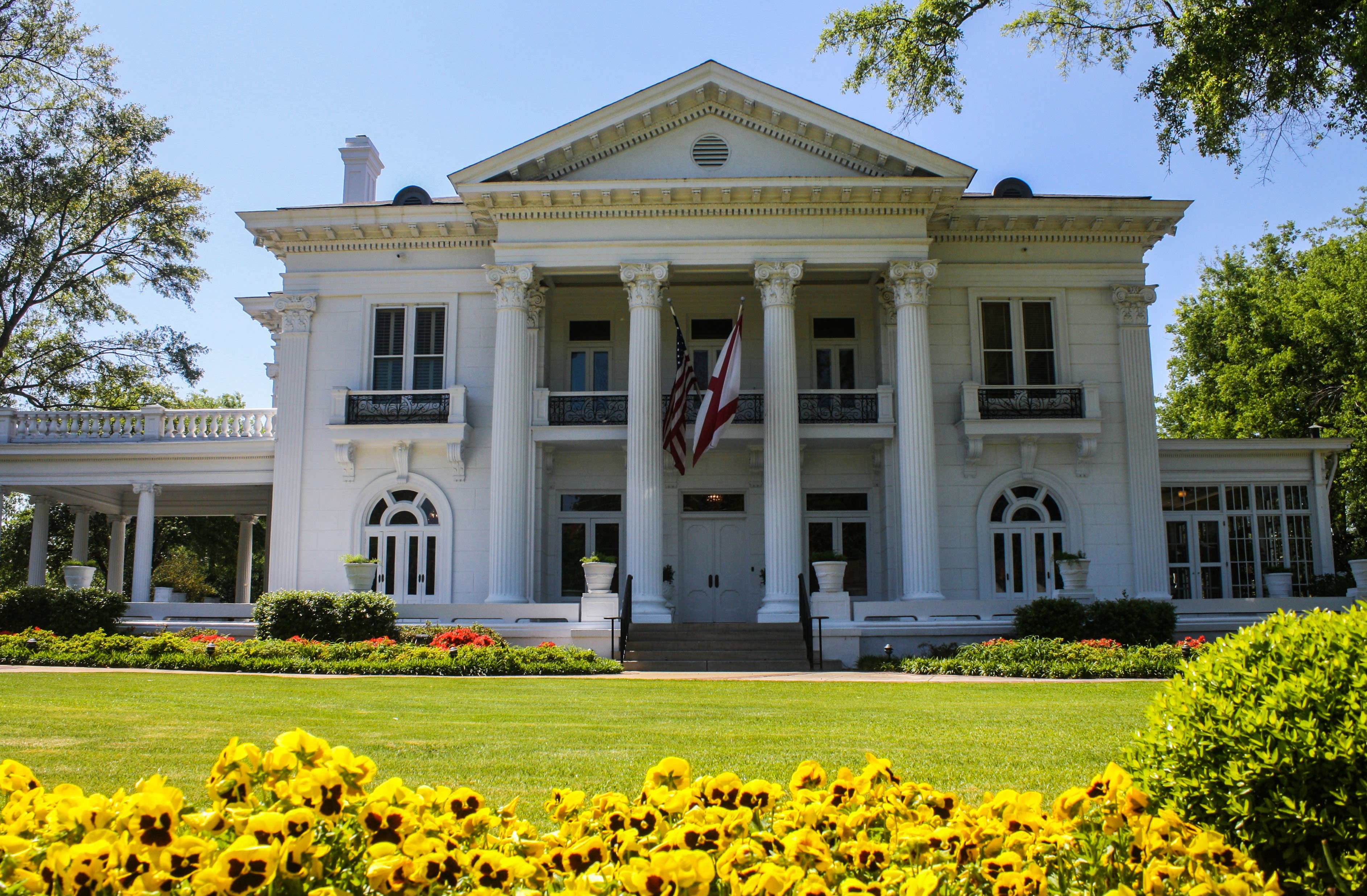Although the Governor’s Mansion was built in 1907, it didn’t become the home of the state’s leader until 1950, when Alabama purchased it for $100,000 and then spent more than that to renovate and furnish it. Originally, the white Neoclassical mansion was constructed for Colonel Robert Fulwood Ligon, Jr., lawyer, clerk of the state supreme court, and son of a Confederate veteran. He died in 1939, and it was his widow who sold it to the state. Two-story fluted columns topped by Corinthian capitals support a large entablature at the front of the building. Ornamental balustrades adorn the second story. To the left, a porte-cochère supports an outdoor space above it; to the right, a glass-enclosed sunroom affords occupants pleasant views of the lovely grounds. Fronted by a well-trimmed lawn abutting a white brick wall with iron railings that separates the property from the sidewalk along South Perry Street—all low enough so that the casual passerby can easily admire the home and grounds—the mansion could not be a classier, more becoming residence for one of Alabama’s highest-ranking officials.