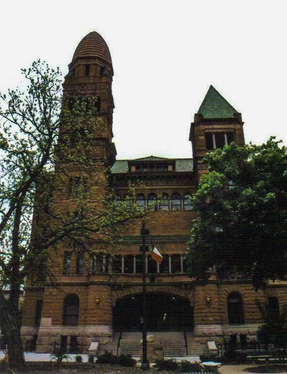 With nearly a dozen national and state historic designations, San Antonio’s most impressive building, the Bexar County Courthouse, stands as the largest historic courthouse in Texas. Designed by the prolific architect J. Riely Gordon, whose credits include 72 courthouses in the United States (18 in Texas) as well as the Arizona State Capitol, the building commands a prominent position on Main Plaza in the heart of downtown San Antonio. Preceded by four courthouses, the current building is the first truly American courthouse in Bexar County; its ancestors were constructed when Texas was part of New Spain, part of Mexico, its own independent republic, and a member of the Confederate States of America. Ground was broken in 1891, and the Romanesque Revival courthouse was completed in 1897, followed by four rounds of expansions over the decades. A project in the early 2000s eliminated the two most recent renovations, restoring the building to its 1927 grandeur. I was attracted to quite a few of the elements, all of which merge into a cohesive beauty that almost makes you want to go to court: the Texas granite base, the red sandstone employed for most of the façade, the red and green roof tiles, and the impressive façade of the north elevation, with its deeply recessed entryway, bands of windows on the upper floors, and the two asymmetrical towers: one topped by a green-tiled pyramidical roof, and especially the other, a taller tower capped by a red-tiled beehive dome.