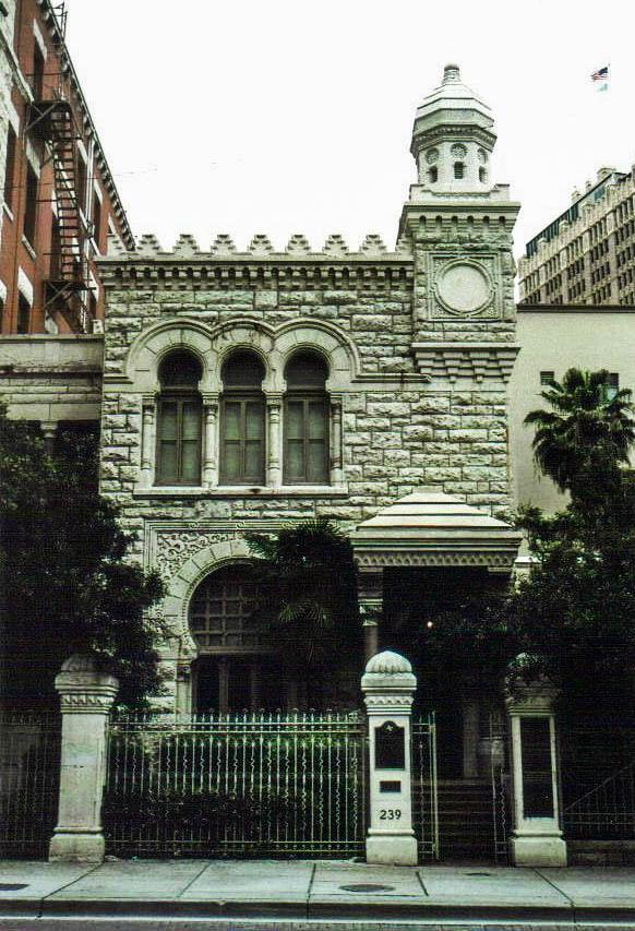 The unexpectedly flamboyant First National Bank Building, just a block south from the River Walk, took me by surprise and made me question whether I was still in Texas. Completed in 1886 as the San Antonio National Bank, the first federally chartered banking institution in the city, the building served as the bank’s fourth structure. Employing rough limestone from local quarries for the entire façade, the building is fronted by ornate ironwork with floral decorative elements in between stone pillars. A decorative octagonal domed tower with intricate medallions in the southeast corner adds a whimsical touch of panache. The most eye-catching feature—the large Moorish arch over the first-floor window and the three Moorish arches above the windows on the second story—lend an air of the exotic to the former bank, which merged with Farmers National Bank in 1925 and continued to operate here until 1970. Added to the National Register of Historic Places two years later, it was purchased and restored by the Maloney family in 1978 and now operates as their law offices. Although I spied a couple of attorneys accessing the entrance under the pediment supported by four deep-rose columns, I wouldn’t have been surprised if a swarthy, robed prince emerged instead.