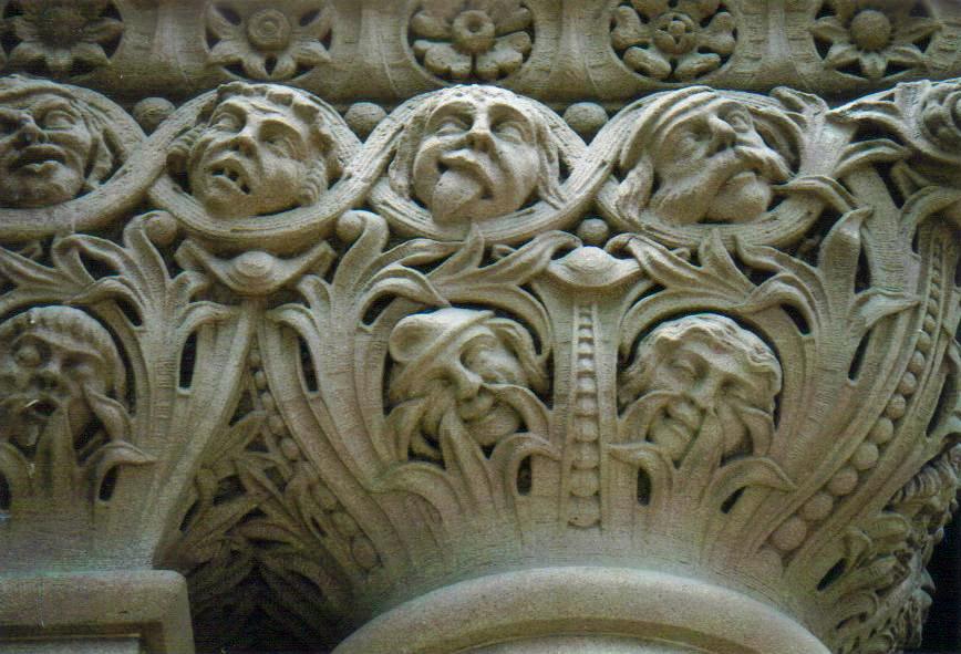 Like the Parliament Building, Toronto’s Old City Hall is a Richardsonian Romanesque masterpiece. Completed in 1899 as the largest civic building in North America, the façade of massive red sandstone blocks with darker brown horizontal bands presents tremendous curb appeal. At 340′ high, the clock tower was the tallest structure in Toronto, with faces that measure 20′ in diameter and enhanced by stone gargoyles that have since been replaced by bronze replicas for safety reasons. Countless miniature human faces representing councilors of the time are carved into the sandstone in the arches and column heads. Urban legend holds that they’re surrounded not by leaves but by the flames of hell—a deliberate dig by the architect, Edward James Lennox, who was brutally criticized by these politicians when the building started racking up cost overruns and construction delays. As punishment, they denied Lennox a plaque on the completed building acknowledging him as the architect. But Lennox got the last laugh: He had the stonemasons carve into the corbels beneath the upper-floor eaves around the entire building this sempiternal message: EJ LENNOX ARCHITECT AD 1898. The interior is fitted with marble columns, a grand staircase, mosaic inlaid tiles on the floor, and murals depicting Toronto’s pioneers. A stained-glass window titled “The Union of Commerce and Industry” definitely grabs attention: Topped by the city’s coat of arms, the window, at 16′ wide by 23′ high, is organized in three arches and features a dozen life-size figures amid scenes of Toronto’s busy waterfront. When I exited the building, I took a seat at the reflecting pool, comparing and contrasting this extraordinary building with the New City Hall across the street—a cold, modern atrocity that looks like it belongs in, say, São Paulo. Clearly, there’s no comparison.