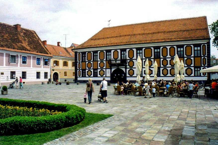 In another square, the Miljenka Stančića Square, I found what has to be the most striking façade in Varaždin. Although it was built in the 1600s, the Sermage Palace acquired its rococo style during renovations in 1759, when it passed via several marriage contracts to the Sermages, a French noble family. Cinnamon-colored geometric medallions framed in black adorn both the façade on the left side of the building as well as the asymmetrical front façade, with the entrance off-center to the left and an unmatched double column of this design to the right further throwing off the balance. A wrought-iron balcony resting on brackets hangs over the front doors. Since 1947, the palace has been the home of the Gallery of Old and Contemporary Masters, located on the second floor after you pass through the acraded courtyard. The collection includes paintings from the 15th century through the 20th, many of which found their way here from nearby castles after World War II. Even if you don’t visit the museum, the palace itself is not to be missed.