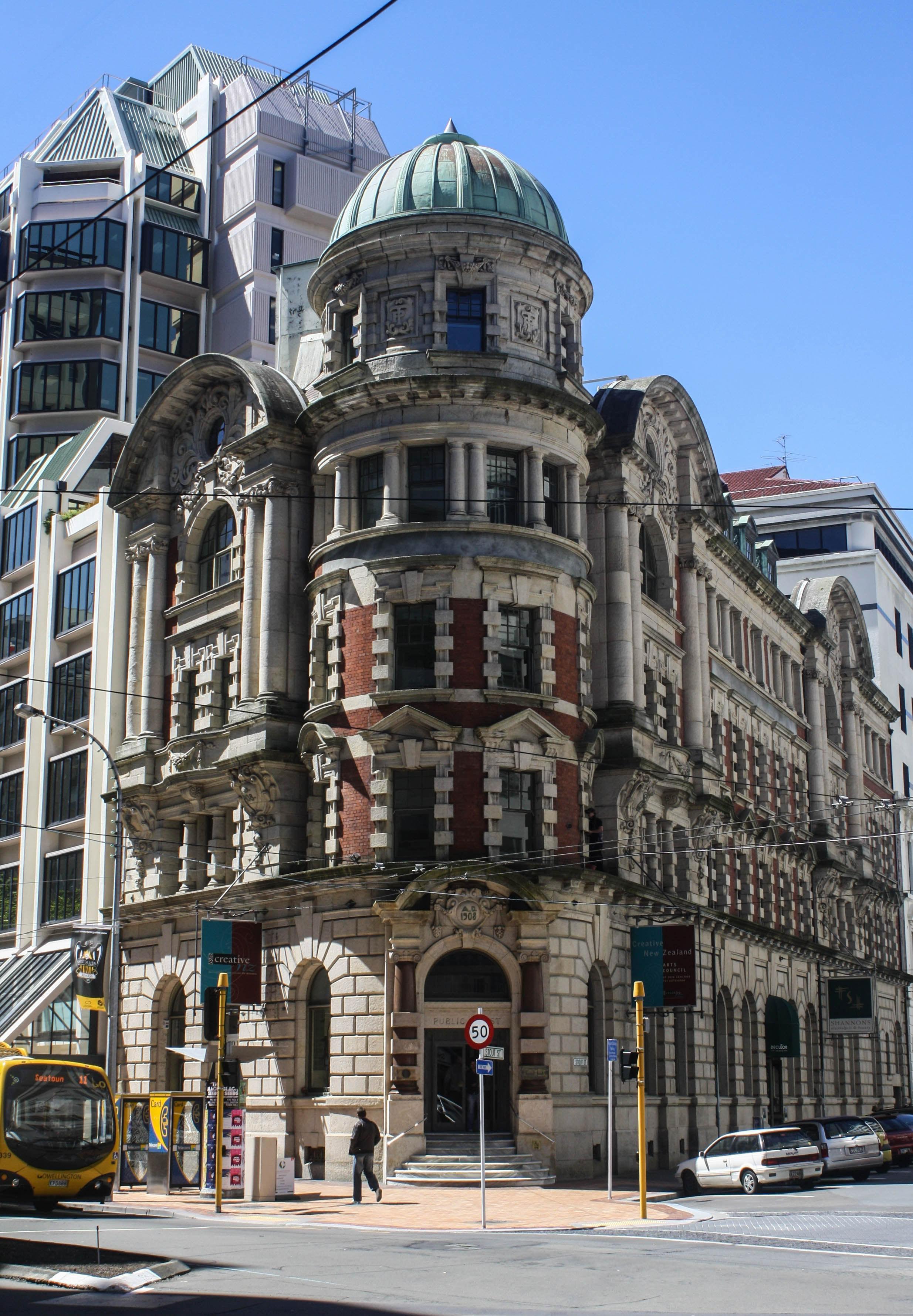 Public trust—it’s something most of us mock these days as an extinct belief in government’s concern for the average citizen. But in 1908, when the Public Trust Office in Wellington (the first such office in the world, founded in 1872) opened its new building, I’m sure passersby would have felt that they were, indeed, in the good, trustworthy hands of the government. The first building in New Zealand to be constructed with a steel frame, this Edwardian Baroque edifice boasts the most elaborate façade in the city, clad in pressed red brick and native Tonga Bay granite. Described by the Wellington Architectural Centre as the “nation’s crowning glory,” it became the quasi-official style of government buildings throughout New Zealand. Situated on a corner lot, with a round tower capped by a green copper dome, this sturdy, formidable building still radiates confidence, presence, and permanence. It was definitely constructed to last—it has survived a 1975 initiative to demolish it as well as an earthquake in 2013. And now, having been strengthened for earthquakes, I trust it will be around for yet another century.