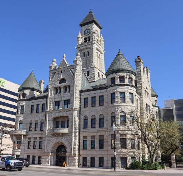 Parking on the street in downtown Wichita for two hours cost me exactly 25 cents. I was already excited. I was here to visit the Wichita-Sedgwick County Historical Museum, with its exhibits that included a history of Wichita, a recreated old drug store (complete with wacky remedies), the story of a locally manufactured car (the Jones Light Six) that cost $995, and a hand-carved walnut grandfather clock from 1871 that cost a whopping $450 at the time. But the building itself, completed in 1892, proved to be just as engaging. Nicknamed the “Palace of the Plains,” City Building (not yet officially City Hall) was intended to be a symbol of the city’s prosperous 1880s. At a total cost of $100,000, the funds ran short during a recession, and the building’s crowning 170’-tall clock tower and its 1,000-lb. bell weren’t added until 1917. City offices, including the police and fire departments and the city’s first public library, were housed in the building. In the 1960s, plans to build a new city hall put the existing building on the chopping block, but public support for its preservation secured it a listing on the National Register of Historic Places. After the city offices moved out in 1975 and a few years of construction and renovation, the museum moved in in 1981 and the five-story building was saved. That means we get to enjoy this limestone beauty that features a bold Richardsonian Romanesque style. The round corner towers are lovely, especially the one on the corner of the street, which features a small balcony that wraps around. Look for sculptures of human heads and winged creatures, gable rooflines, and squat columns, and, inside, for fine stained-glass windows. And if you’re losing track of time, just throw your head back to look at any of the four clocks in the tower that measure eight feet in diameter.
