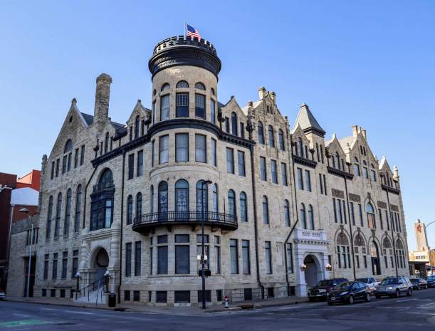 Wichita Scottish Rite Center began its life in 1888 as a YMCA—but that didn’t last very long at all. Only a decade later, suffering from a loss of financial support and reeling from a price tag of $60,000 that exceeded the budgeted $36,000, the YMCA was forced to sell it. The Scottish Rite Freemasons purchased it in 1898 and made expansions in both 1905 and 1956, including a stage and a 300-seat auditorium. Added to the National Register of Historic Places in 1972, the Romanesque-style building features an eye-catching battlemented tower with iron grillwork and stained-glass windows. The roofline is a jumble of chimneys and gables. The arched south entrance has clusters of short columns and is topped by a bay window featuring stained glass; the other arched entrance features an entablature with dentils and a balustrade resting on brackets. To its right, the first-floor stained-glass windows are topped by stone shields and arches with beautifully carved keystones and panels. Solely through the efforts and donations of the center’s membership has this building managed to maintain its status as one of the most beautiful in Wichita.