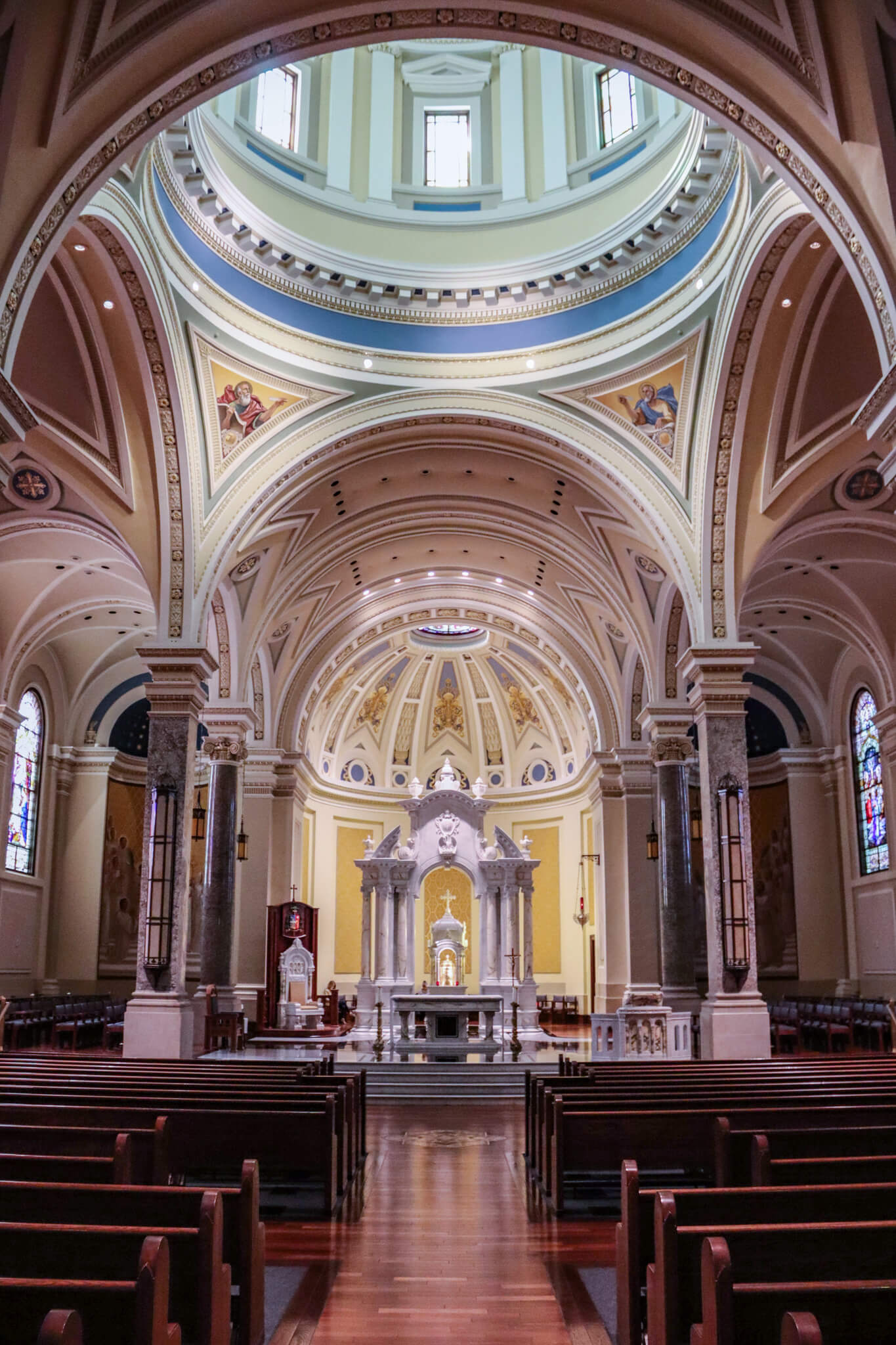 I stepped inside the bright interior and made my way down the central aisle, flanked by more granite columns supporting arches with detailed soffits, to the slightly elevated sanctuary. The uniform use of white marble in the altar, ambo, tabernacle, cathedra, and reredos (decorated with a shield bearing the letters IHS, the Latinized abbreviation of the first three letters of Jesus’ name in Greek, and a pelican, an ancient Christian symbol for the Holy Eucharist—a mother pelican will feed her chicks with her own flesh and blood when nothing else is available) creates a cohesive display.
