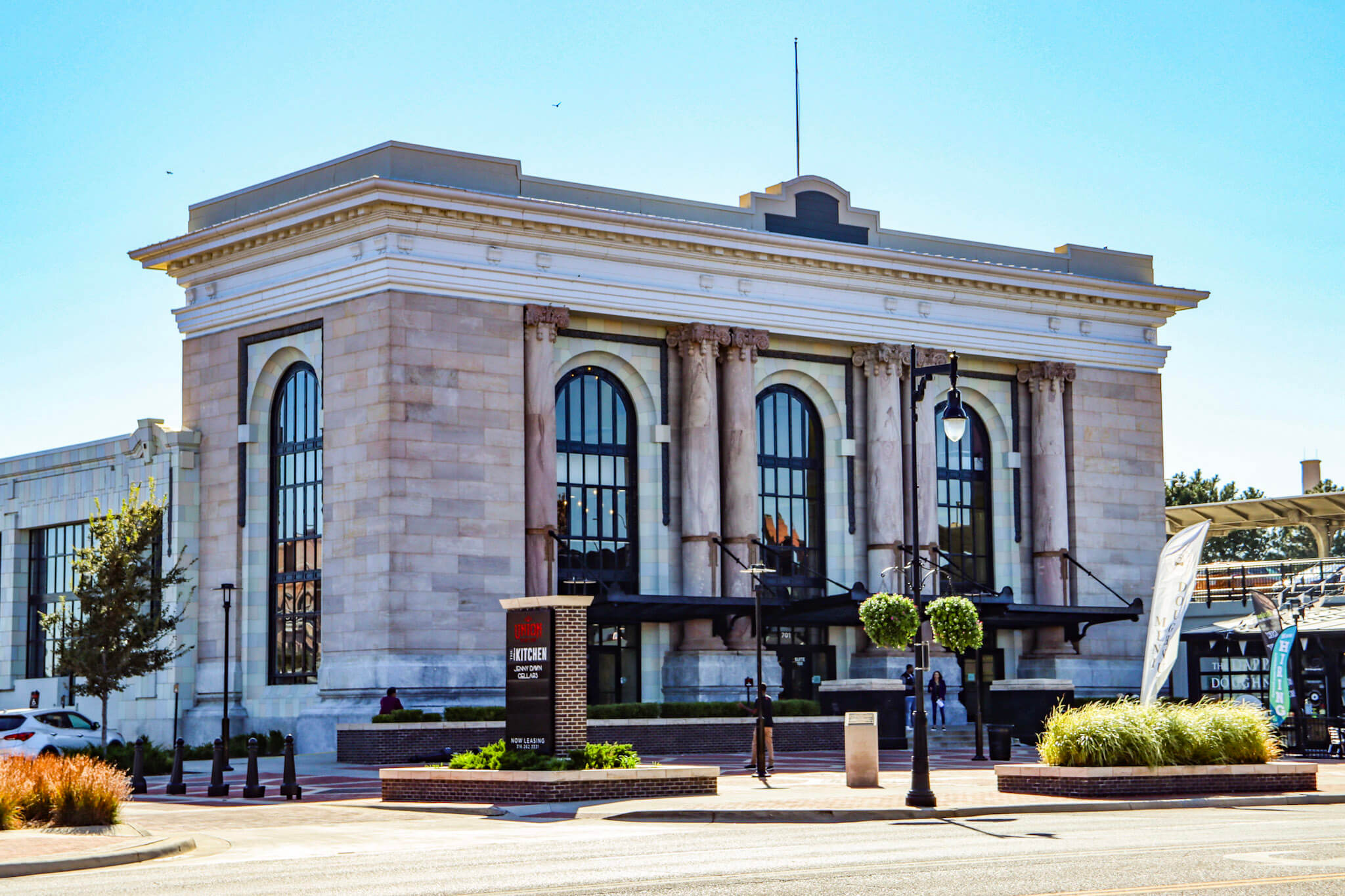 In the 1800s, there were no rules on how long trains could block traffic on Wichita’s streets. To resolve the problem, and to unite multiple different rail lines under a single roof, in 1909 the city’s mayor proposed elevating the tracks so that pedestrian and vehicular traffic could pass safely underneath. That meant building a new train station, and by 1914, Union Station was open for business. This wonderful Beaux Arts–style station, erected at a cost of $2.5 million, employed such materials as gray Bedford stone, gray terra cotta, plaster, and lots and lots of glass, so much so that the station was dubbed the “Daylight Station of America.” The main waiting room, measuring 165′ long, 125′ wide, and 25′ high, was flooded with so much light that one could read in any corner of the station on a bright day without the need for artificial lighting, and the huge windows also helped to showcase the decorative elements inside. Passengers would approach the main entrance, a lovely façade with soaring arched windows, each framed by a pair of Corinthian columns, via a circular driveway that allowed cars and carriages to drop them off under a weatherproof arcade. Inside, three meticulously maintained clocks would keep them on schedule while they shopped at the newspaper and fruit stand (long gone), snacked at the soda fountain (also gone), or dined in the state-of-the-art Harvey House dining room, which housed the station’s only stained-glass windows as well as a marble lunch counter and marble-topped tables (only the stained glass remains). As rail travel decreased, Union Station began to fade and show its age, and the last passenger train departed in 1979. After a stint as a telecommunication company offices, the newest owners have transformed it into a destination space, with retail, offices, and restaurants. The approach was redeveloped as a welcoming plaza with a pleasant brick and cement pattern, and the façade has been spruced up, making Union Station relevant, and beautiful, once more.