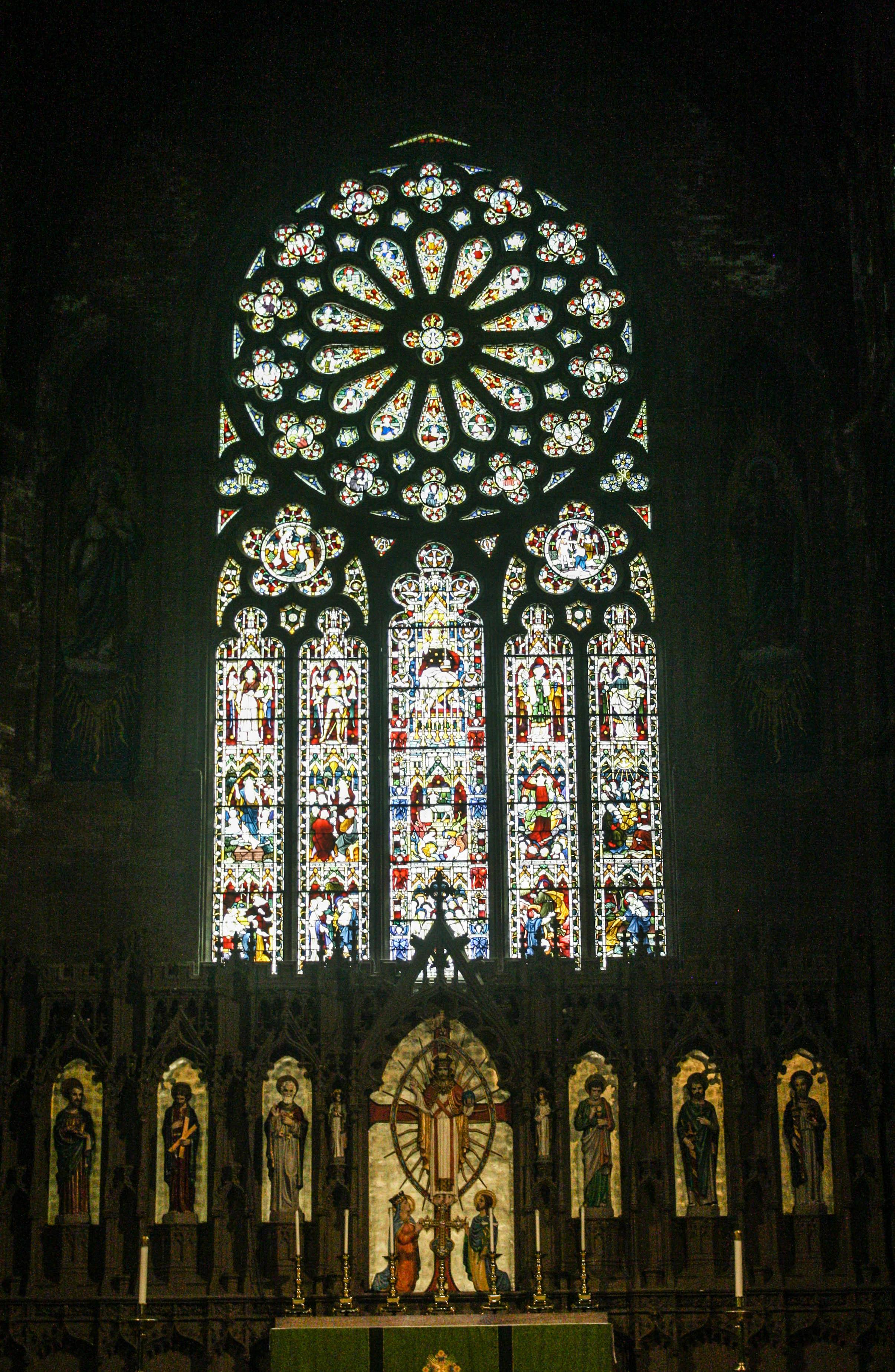 Designed as a High Gothic cathedral similar to those in Europe in the 11th and 12th centuries, and constructed with the same materials and methods, The Cathedral of All Saints was “completed” in 1906 as the first Episcopal Cathedral church in the United States built expressly as such. But the cathedral didn’t fully achieve its much larger designs: Adjacent land purchased in the interim by other parties prevented that, and subsequent development around it has ensured that it never will. Despite falling far short of its aspirations, it still stands at 320′ long and 130′ wide, making it the fifth-largest cathedral in the United States (and 29th largest in the world). The cavernous interior features fantastic stone carvings, a beautiful rose window designed by John La Farge, and choir stalls from 1655 that were salvaged from a demolished church in Bruges, Belgium. Rather than marble or white limestone, brownstone was selected for the pillars, a choice that deliberately made the space look and feel old, even when it was new. The walls of the side aisles are hung with small and extremely simplified Stations of the Cross, but there’s nothing small or simple about the Great East Window. Crowded into the window are saints of early Christianity and the Church of England as well as key events in the lift of Christ, including the Resurrection and the Ascension. More than 40′ tall and 22′ wide, it’s one of the largest stained-glass windows in the world, and when it’s backlit by the morning sun, the lucent window glows with heavenly light.