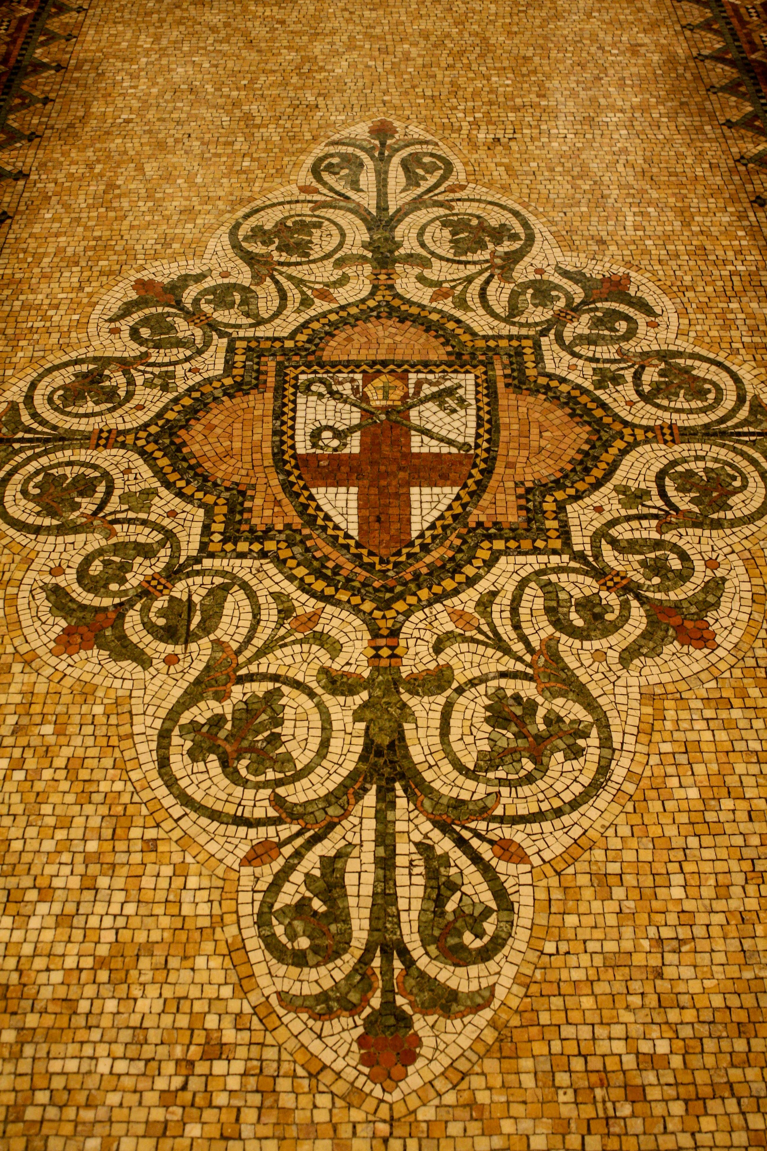 One of my favorite architects, the great Richard Upjohn, designed the lovely St. Peter’s Episcopal Church in the French Gothic style in 1876. The asymmetrical façade of this National Historic Landmark features a rose window designed by Tiffany in 1890 and a 180′-tall tower with turrets, three-ton gargoyles, and three lancet windows on each side, gracing State Street, downtown Albany’s main drag, with one of its most striking buildings. Inside, a series of arches sustain the clerestory, rising from octagonal stone columns. Above, a beautiful wood ceiling is a masterwork of tracery, and the vivid stained-glass windows bathe the interior in colorful light. My favorite feature unfolded beneath me. The gorgeous mosaic flooring throughout the church bears both straight-out messages (“I am the vine, ye are the branches” and the Ten Commandments) and elaborate Christian symbolism, such as an anchor (representing hope), a pelican (redemption), and a lamp (good works), as well as shields holding the traditional symbols of the 12 apostles and of St. Stephen, David, St. Paul, and Moses.