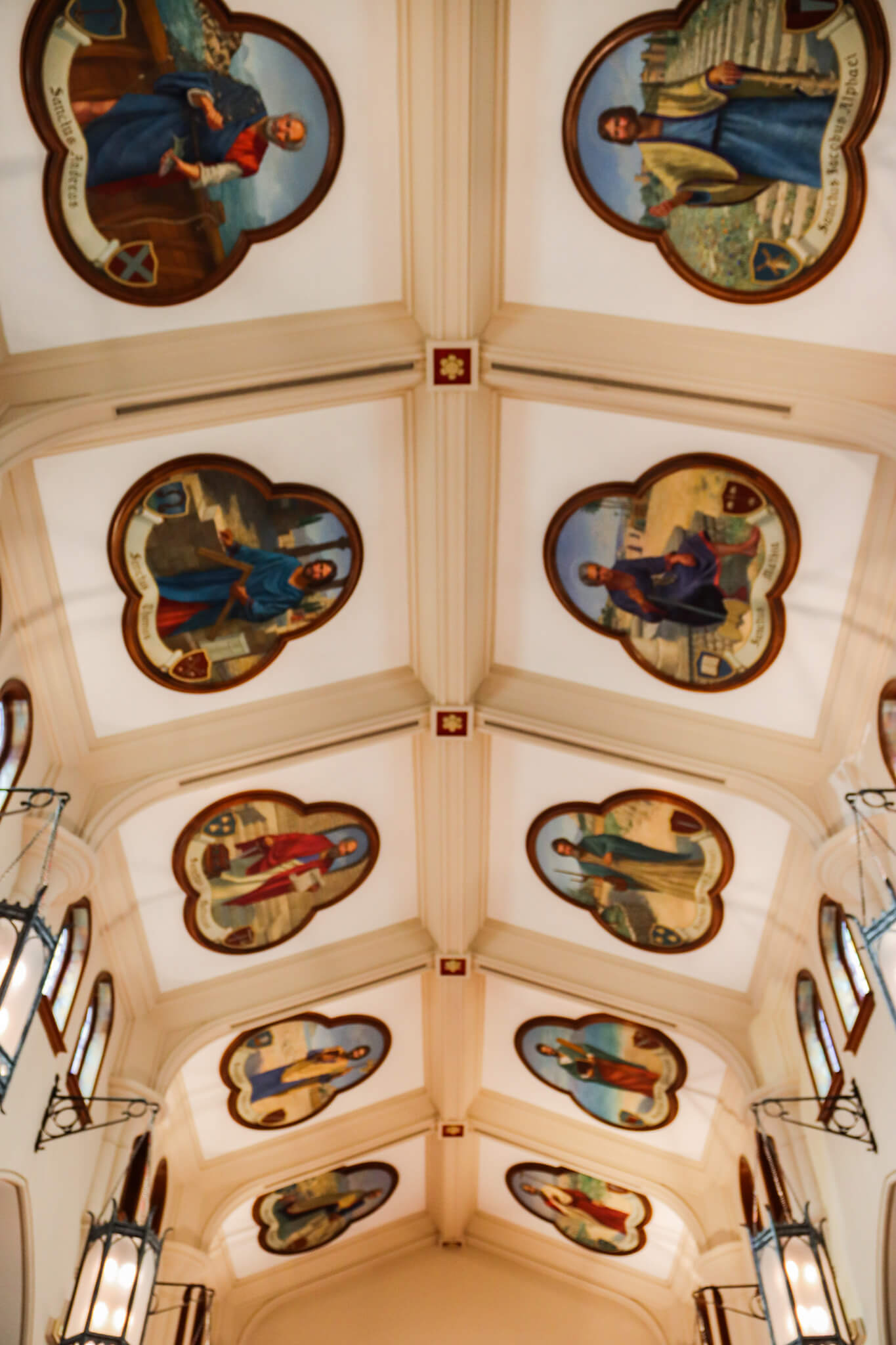 Dedicated in 1898, consecrated in 1920, and elevated to its current basilica status in 2010, the Basilica of the Sacred Heart of Jesus makes a noticeable appearance in downtown Atlanta, with its bold red brick and terra cotta façade, twin octagonal towers (at 137’ high) with conical roofs topped by crosses, rounded arches, and rose window. Inside, two rows of columns and arches march down the nave toward the triumphal arch, complete with five symbols—one for Christ, the others for the four evangelists. In the sanctuary, a life-sized crucifix stands under the dome of the apse, painted with the figure of Christ, His Sacred Heart aglow as He stands on a globe within a mandorla and flanked by two angels with fantastic wings, one bearing the crown of glory, the other holding the crown of thorns. At the opposite end, behind me, the pipes of the organ flare out from the rose window, with the Sacred Heart in the central panel. Along the side aisles, 14 stained-glass windows, made in Munich and installed in 1902, depict key moments in Jesus’ life, including the Wedding Feast at Cana, the Last Supper (sans Judas), and the Crucifixion. Other objects that caught my attention included the Philippine mahogany confessionals, brass kneelers, intricately detailed brass pulpit, Victorian candelabra flanking the altar, and the deliciously elaborate baptismal font. Everything combines to form a wonderful spiritual space that continues to attract many visitors, including Mother Teresa in the 1990s.