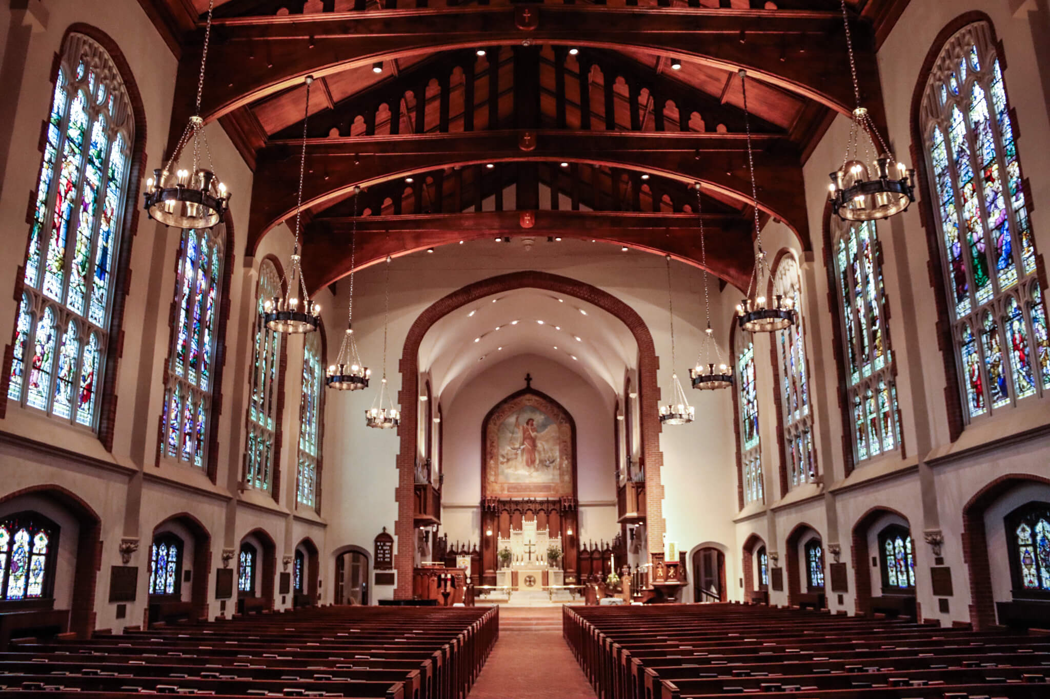 I emerged from Atlanta’s uncrowded subway, the Metropolitan Atlanta Rapid Transit Authority, locally just plain MARTA, and found my destination directly across the street. All Saints’ Episcopal Church comprises an entire campus, with three halls, a community center, a children’s center, a playground, a lovely courtyard, and, of course, the church. Completed in 1908 and constructed with attractive sandstone in the Gothic style, the church features a soaring spire with a herringbone pattern, now turned a verdigris green. I had scheduled an appointment for the staff to open the church for me to take a look, and they very politely accommodated me. Left by myself to wander around, I marveled at the vast interior. With no side aisles, the nave is a tremendous, open space, with a phenomenal wood slanted ceiling with arches and brackets. The All Saints’ seal—the cross and the crown symbolizing the feast of All Saints, and a phoenix representing both the resurrection and the city of Atlanta—is stenciled in gold on the vibrant red walls of the chancel and apse. Organ pipes, topped with angels blowing trumpets, flank the main, massive window above the main entrance, with each panel depicting a small Biblical scene. Break out the binoculars to see, for instance, the Annunciation or the Nativity, or the symbols for the four evangelists. Gorgeous Tiffany windows unfold Christ’s life in chronological order, while smaller windows depict Noah’s Ark on the flood waters, with a rainbow arcing above it. In a connected chapel, large enough to be a small church in and of itself, I found more stained-glass windows: Joseph’s multicolored robe, Moses holding the Commandments with lightning bolts above his head, Noah and his ark with pairs of giraffes and kangaroos, and one figure I had never seen in a church before—Mother Teresa, dressed in her traditional white robe with blue trim.