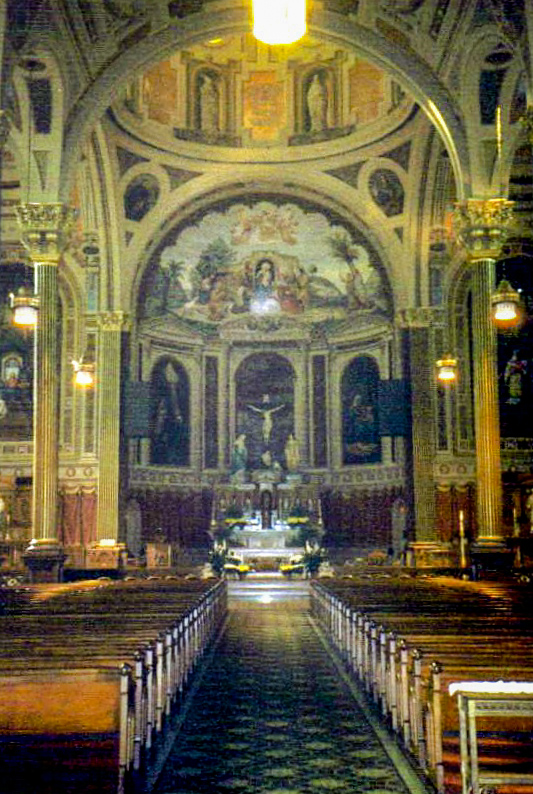 The other church in Covington that I had to see was Mother of God Church, a fantastic structure from 1871, built in the Italian Renaissance style for a German congregation. (“Mutter Gottes Kirche” is still etched into simple panels above the three arches at the front entrance.) The tallest building in Kentucky until 1910 (and added to the National Register of Historic Places in 1973), it beckons visitors with a trio of crosses on the pitched roof, between the wonderful dome and the pair of soaring 200’ bell towers with clocks. It also appeared closed when I arrived. I passed by the stone statues of saints Peter and Paul and the pair of mythological lions in front of the church, all created by an art institute in Munich, and rang a doorbell in hopeful anticipation. A man walking by asked if I was waiting for someone, and when I explained my purpose, he stopped what he was doing, reversed direction, showed me another entry, and told me to go through the gate and up the ramp and ring another bell at a door where I’d be admitted. This was his parish church, he explained, and said it was very beautiful, the most beautiful he’s ever seen, and told me to enjoy it. Sure enough, the door was soon opened to me by the floor sweeper, who promptly welcomed me in and handed me some guides. The pedestrian’s brief encomium wasn’t just bluster; he was absolutely correct: This church is very beautiful.