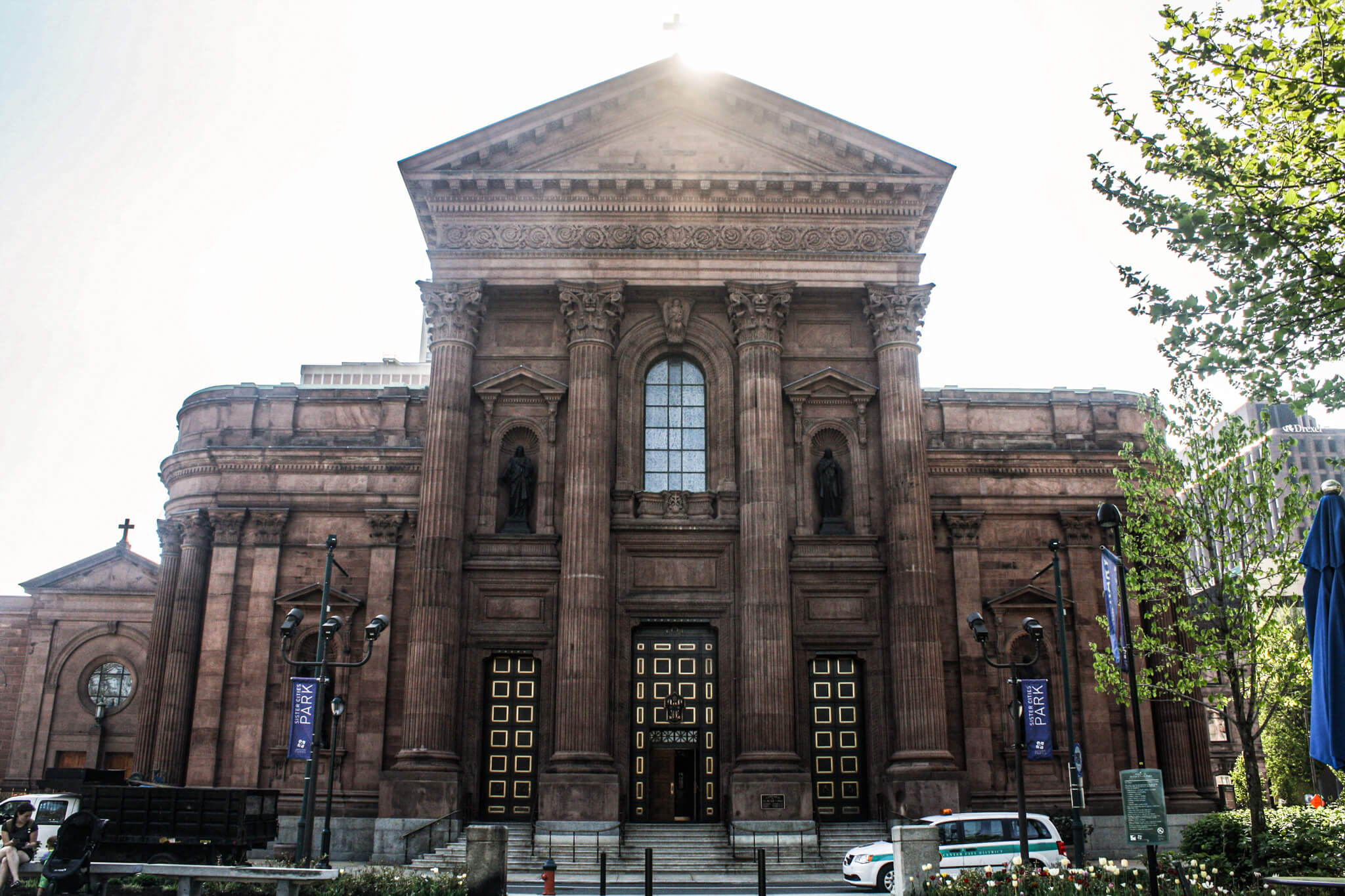 Just a short walk from Philadelphia’s iconic City Hall, the Cathedral Basilica of Saints Peter & Paul ranks as the largest brownstone structure in the city and the largest Catholic church in Pennsylvania. Standing in the park across the street from it and admiring its beauty, I could easily understand why recent popes chose to celebrate mass here: John Paul II in 1979 and Francis in 2015. Begun in 1846 and completed at the height of the Civil War in 1864, the church operates as the head church of the Roman Catholic Arch Diocese of Philadelphia. At the façade, fluted Corinthian columns soar up 60’ and support a pointed pediment with a plain tympanum but a highly decorated frieze. Four bronze statues of St. Peter, St. Paul, Jesus, and Mary that were added in 1915 stand in niches. An 11’ gold cross tops the massive aqua oxidized-copper dome behind it.