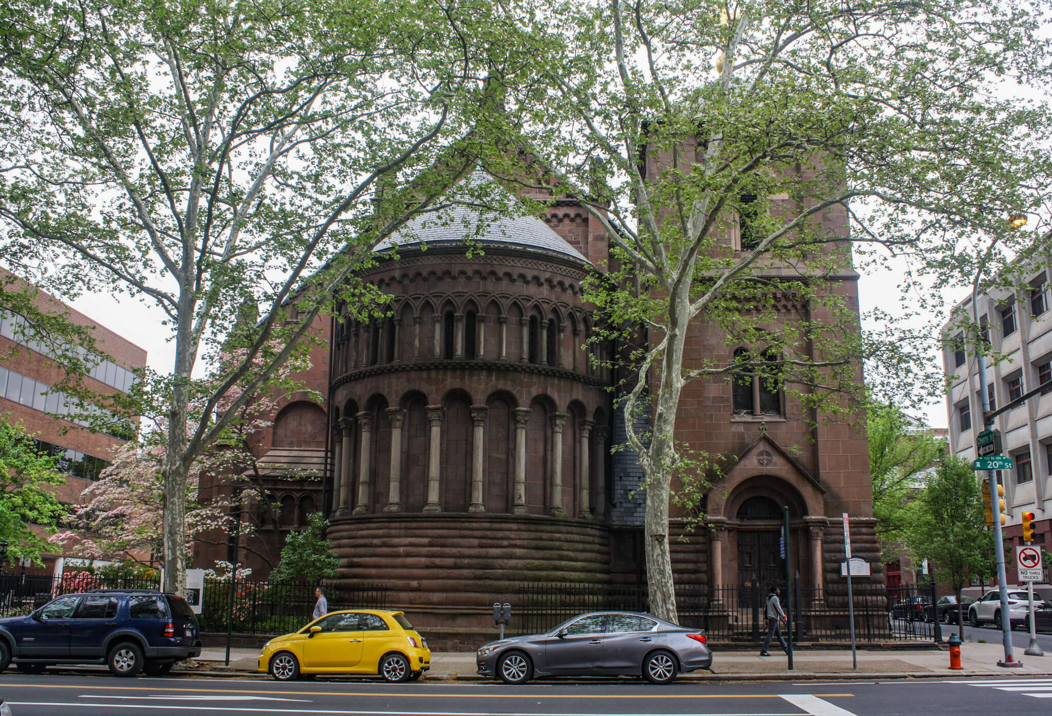 I came across St. Clement’s Church by accident, while strolling around Philadelphia. Its eye-catching exterior made me want to know more. Completed in 1859 after three years of construction, this Anglo-Catholic church lost its spire 10 years later, when it was determined to be too heavy for the foundation. It also lost its original location, when the church building, including the rectory and parish house and weighing 5,000 tons, was lifted onto steel rollers and moved 40’ away over the course of five days in 1929 to allow for a street widening. In 1970, it earned a spot on the National Register of Historic Places. With a Romanesque Revival style, this brownstone beauty features a bell tower, buttresses, and a bold, magnificent semicircular apse with two levels of blind arcades with columns and arches. Along one side, a brick-paved garden of trees and flowering plants invites you in for a calming stroll.