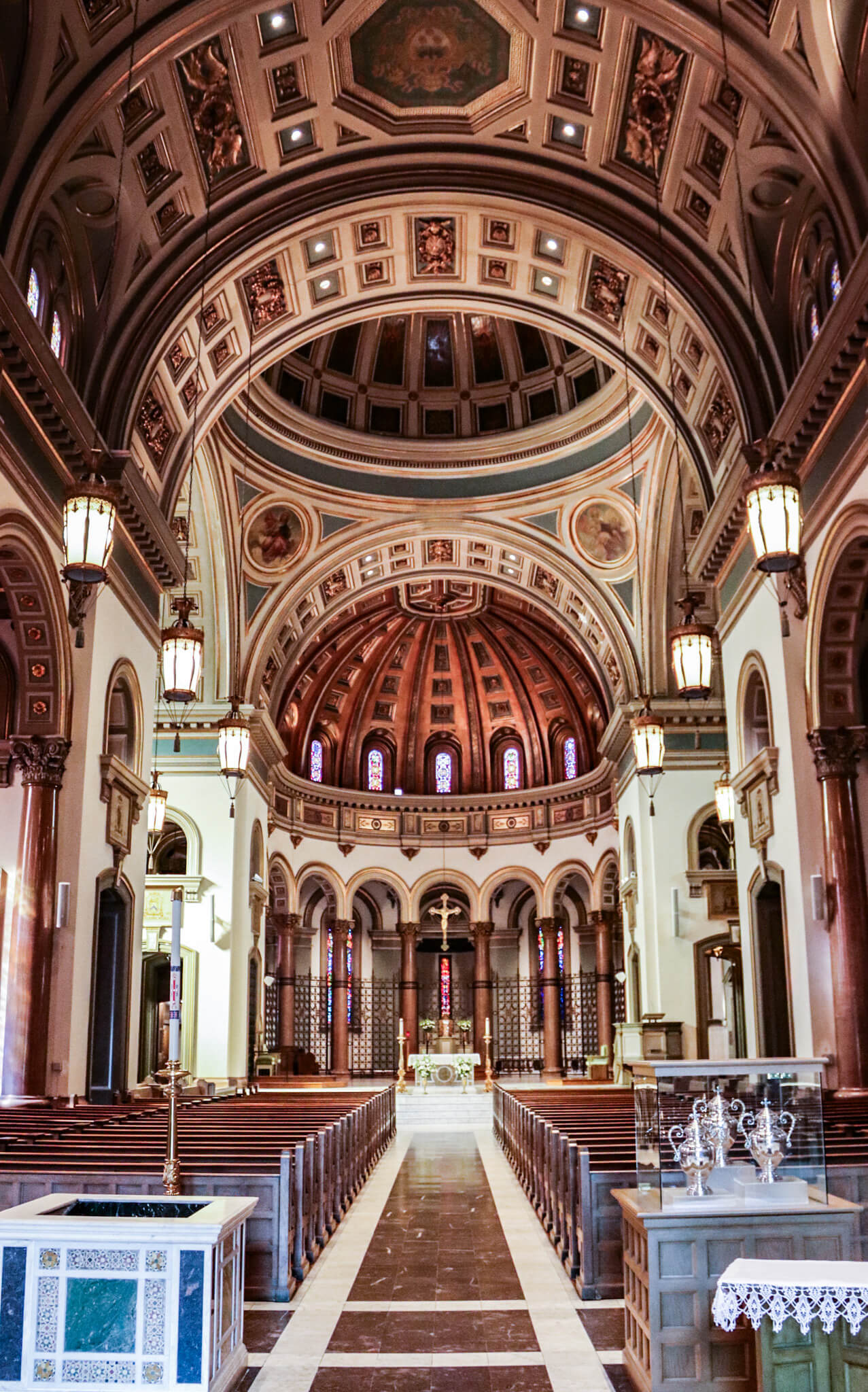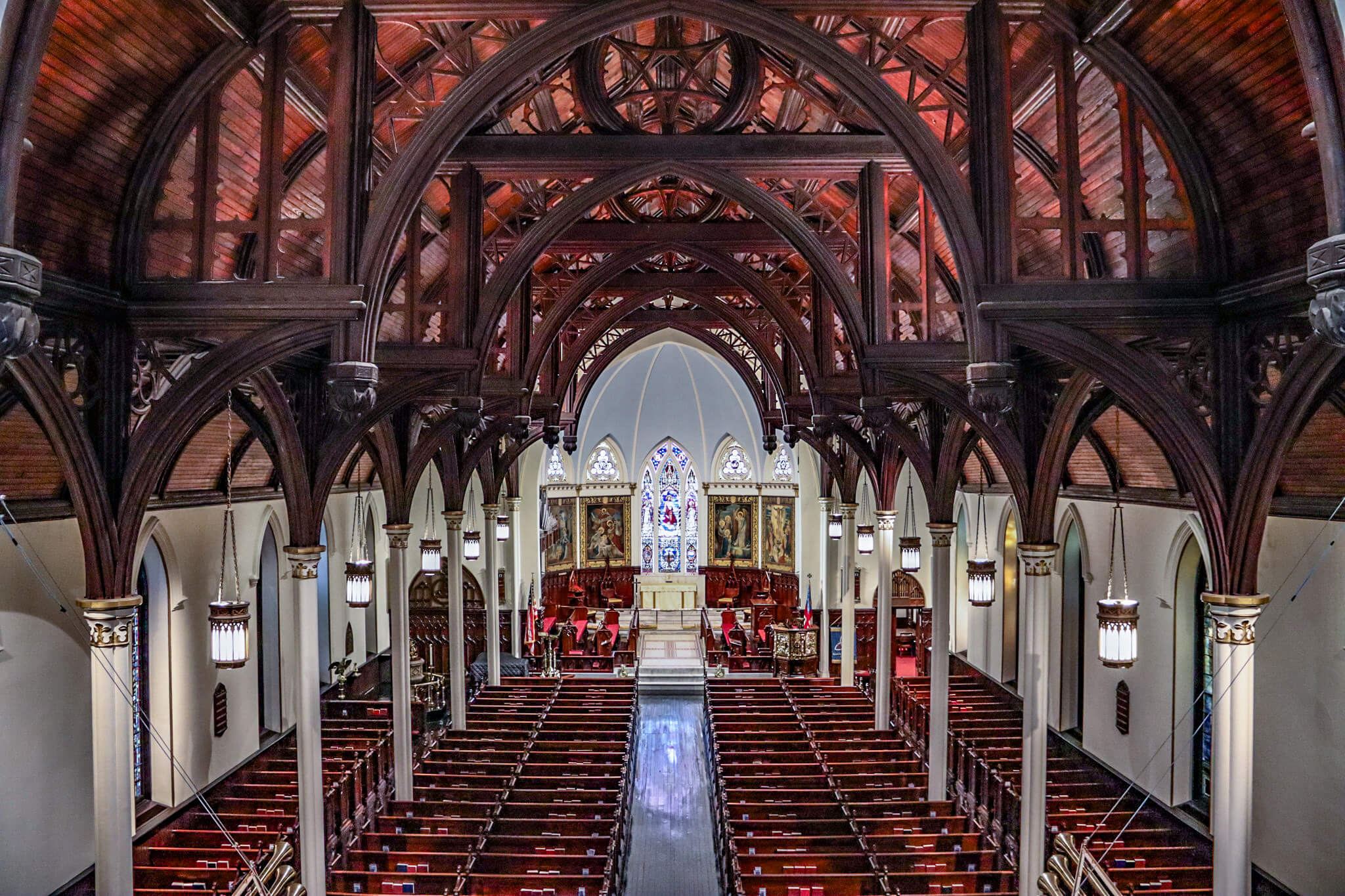 Right next door to the Cathedral of the Sacred Heart stands Grace & Holy Trinity Episcopal Church, preceding its neighbor by 18 years. Originally, this was the house of worship for Holy Trinity; a merger with Grace Church in 1924 brought them together here. With its requisite red doors for an Episcopal church, this wonderful asymmetrical church was constructed in a late French Gothic design from stone quarried in south Richmond. The corner 110’ bell tower contains 10 bells, installed in 2023 as a generous gift from an anonymous donor; it used to have a steeple, until a tornado in 1951 wrecked it. I smiled at the sole grotesque protruding from where the rounded interior stairwell intersects with the front wall, a decorative element to keep all those evil spirits away. Although the church was closed, one of the staff was kind enough to open it just for me and then proceeded to give me an informative tour. My attention was immediately grabbed by the gorgeous vaulted wood ceiling above the walnut pews—a Gothic triumph. Behind the altar, four murals have been gracing the chancel for more than 80 years. Depicting the Annunciation, the Nativity, the women at Jesus’ tomb, and the Ascension, the murals suffered damage from dirt and contaminants flowing in through open windows for decades before the advent of air-conditioning. Chemicals failed to clean them, so the solution came rather unexpectedly: A cleaner licked a Q-tip cotton swab and dabbed the canvas, stunning herself when it removed the soot. A synthetic saliva was created, and the murals are now as beautiful as they were originally. There’s also a great brass pulpit and some wonderful stained-glass windows, including the “angel window,” created by Tiffany Studios and installed in 1905. My visit wrapped up with a climb halfway up the bell tower via a claustrophobic spiral staircase, which also provided a bird’s-eye view of this remarkable structure.