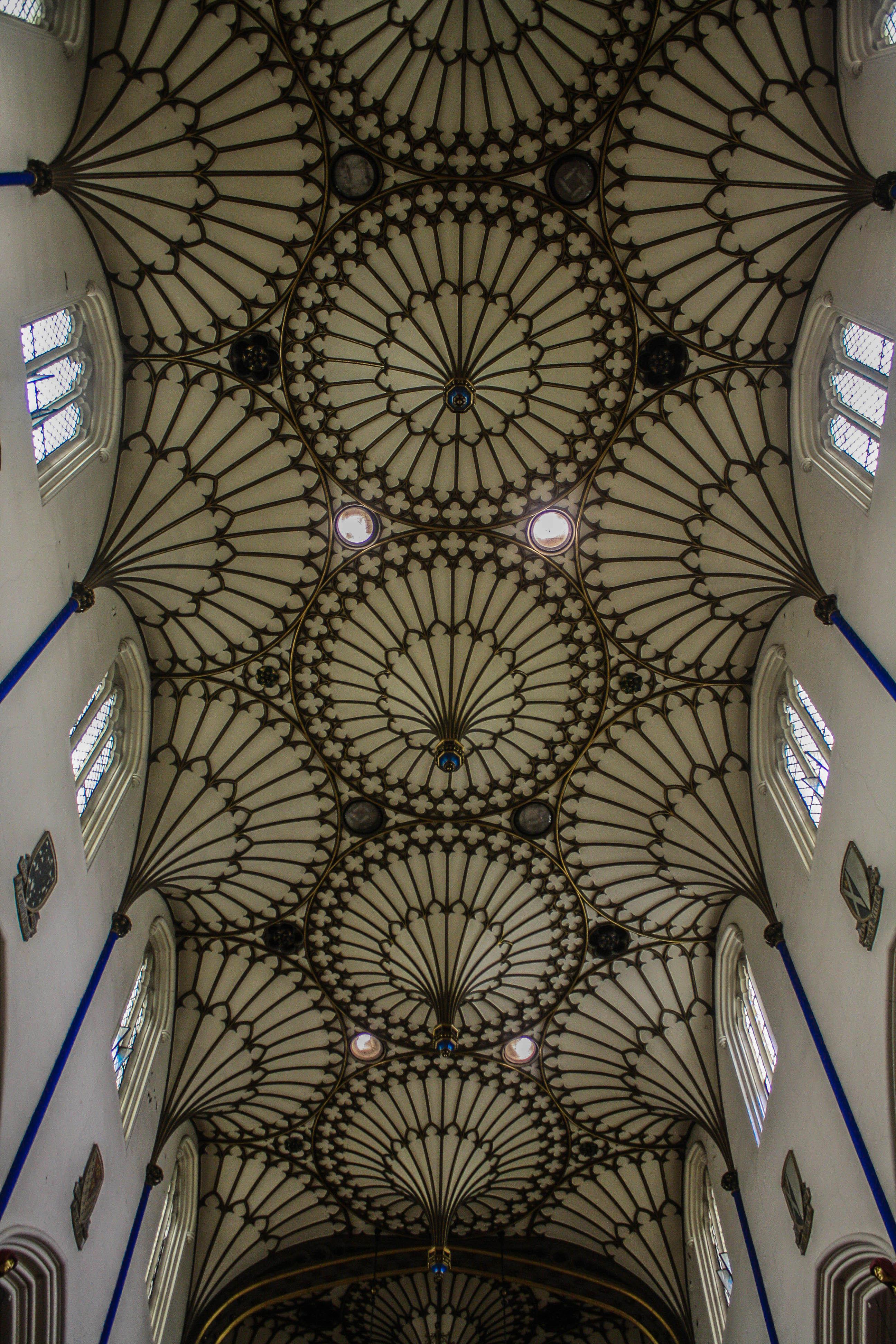 When William Burn was 25, this wunderkind designed the gorgeous Church of St. John the Evangelist. I approached the church via its adjacent graveyard, filled with gravestone of authors, historians, doctors, engineers, the beknighted, and one lady born a slave, most of whom died in the 1800s. The interior immediately dazzled me, and I envied the young architect’s vision and talents. Designed in 1815 but not completed until the early 1900s, the church features some exceptionally vibrant stained-glass windows, a lovely organ, and a black and white checkerboard marble floor. By far the most arresting feature is the absolutely gorgeous plastered fan-vaulted ceiling, modeled after the ceiling in the Henry VII Chapel in Westminster Abbey, itself one of the top five churches in London. Each circle, with its exquisite tracery, drips down from the ceiling into a pendant the same cobalt blue as the slender columns rising up the walls. It’s the highlight of this church, easily making it one of the most beautiful in both the Scottish capital and the country.