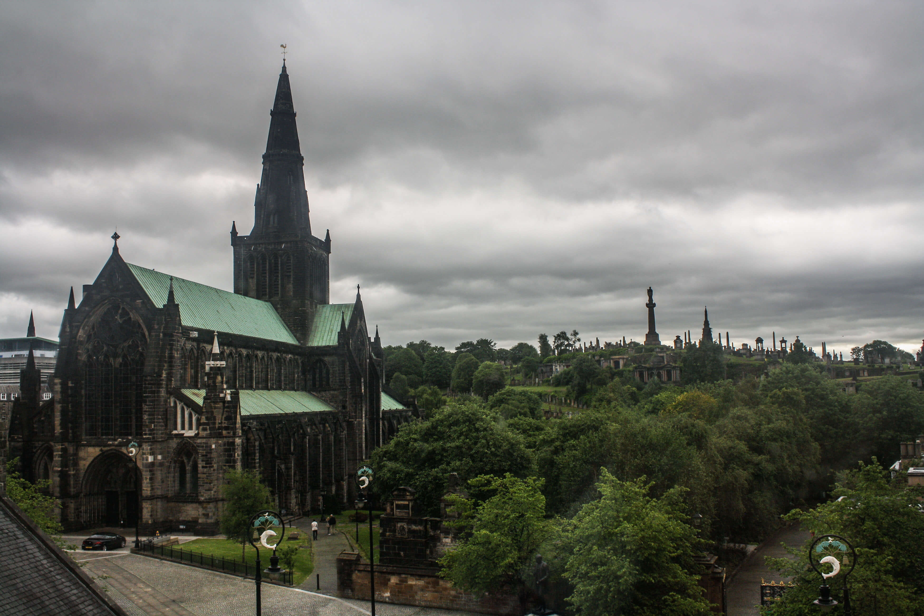 The best view of the massive Glasgow Cathedral, the oldest building in the city, can be seen from Glasgow Necropolis, a Victorian cemetery, atop a hill, founded in 1832. It served effectively as a beacon, drawing me to it, until I stood beside it, dwarfed by its tremendous size. It was consecrated in 1197, making it the oldest cathedral in mainland Scotland. The cathedral is allegedly located where the patron saint of Glasgow, St. Mungo, erected his church. Built before the Reformation and serving as the seat of the bishop and later the archbishop of Glasgow, the cathedral is a superb example of Scottish Gothic architecture, although it technically is no longer a “cathedral,” as it has not been the seat of a bishop since 1690. Crown property since 1587, the cathedral passed into the care of the state in 1857, and, because of this transfer, the assured funding for upkeep, the church survives in all its glory (well, most of it)— two towers were demolished in the 1840s. What remains is still astoundingly cohesive and vast. Badly discolored by pollution (Glasgow was one of the dirtiest cities in Europe for decades, when it was an industrial powerhouse), the exterior is a riot of pinnacles, three levels of Gothic arches, slanting verdigris-green roofs, and a central tower with a soaring spire. Through the recessed double-door portal, with jamb columns and unadorned spandrels and trumeau, I entered this spectacular place. I made my way through the first section, with its cluster columns, ribbed arches, and stone floor. Then I climbed a few stairs and passed through the stone rood screen into the more elaborate second section, with its carved pew ends, organ pipes high above me, and a gorgeous wood ceiling with painted bosses. There’s plenty of beautiful stained glass to admire, where you’ll spot Adam and Eve, saints Mungo and Stephen, and baby Moses in a basket bumping into reeds on the Nile. The fantastic Great West Window depicting “The Creation” dates from only 1958, and the even newer Millennium Window wasn’t added until 1999. Don’t forget to head downstairs to the darker lower church to see the chapel and tomb of St. Mungo.