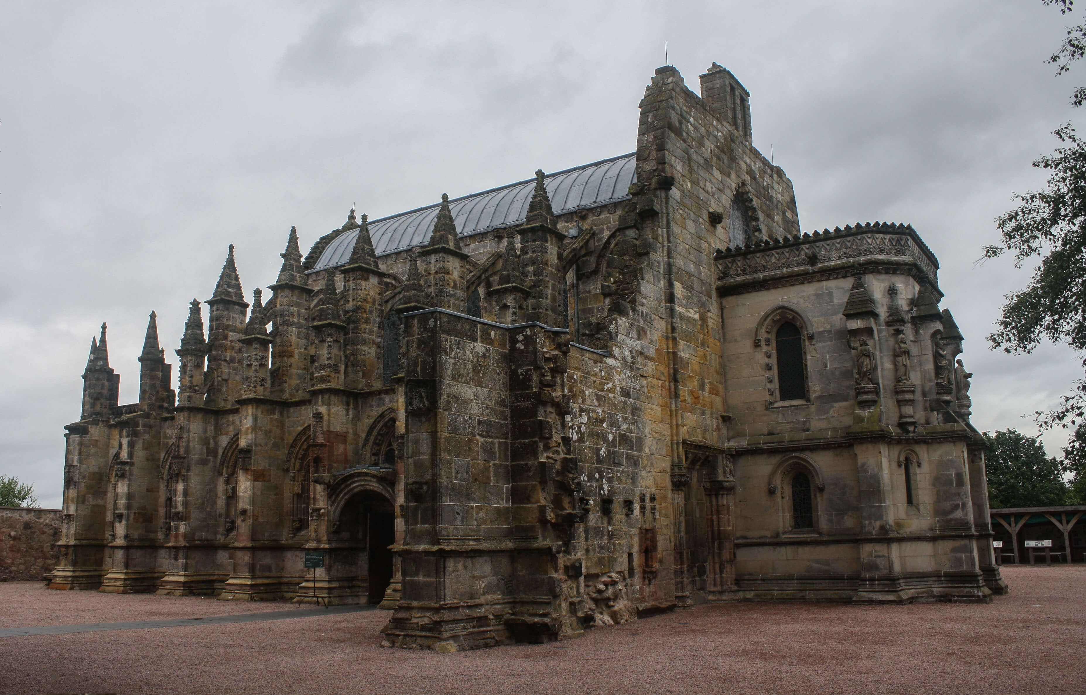 I boarded a bus for a 45-minute trip from Edinburgh to Roslin Glen. There’s a park there that contains the ruins of Roslin Castle from the 1500s, but the main draw is Rosslyn Chapel. Founded as a Catholic collegiate church in 1446 and completed by 1486, it’s famed for its sculptures. Prominently featured in The Da Vinci Code, and long associated with legends of the Crusaders, the lost Scrolls of Solomon’s Temple, the true Stone of Scoon, and the Holy Grail, it’s now attracting more tourists than ever. A guide provided a captivating 30-minute presentation about how, after the Scottish Reformation (1560), Roman Catholic worship in the chapel was brought to an end; the altars were destroyed in 1592, and the chapel was abandoned, gradually falling into decay. From that time the chapel was closed to public worship. In 1842, however, Queen Victoria visited the chapel, now in a ruined and overgrown state, and expressed a desire that it should be preserved. During its ruinous state, the soft, absorbent sandstone used in the construction, which was terrific for sculpting, proved to be a poor material for longevity. The exterior sculptures fell apart, and the interior, damp and unkempt, suffered from moisture damage, to the point where the walls were becoming a mossy green. Restoration work was carried out, and the chapel was re-dedicated in 1862.