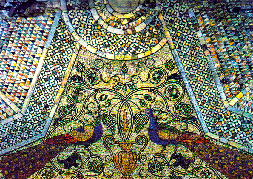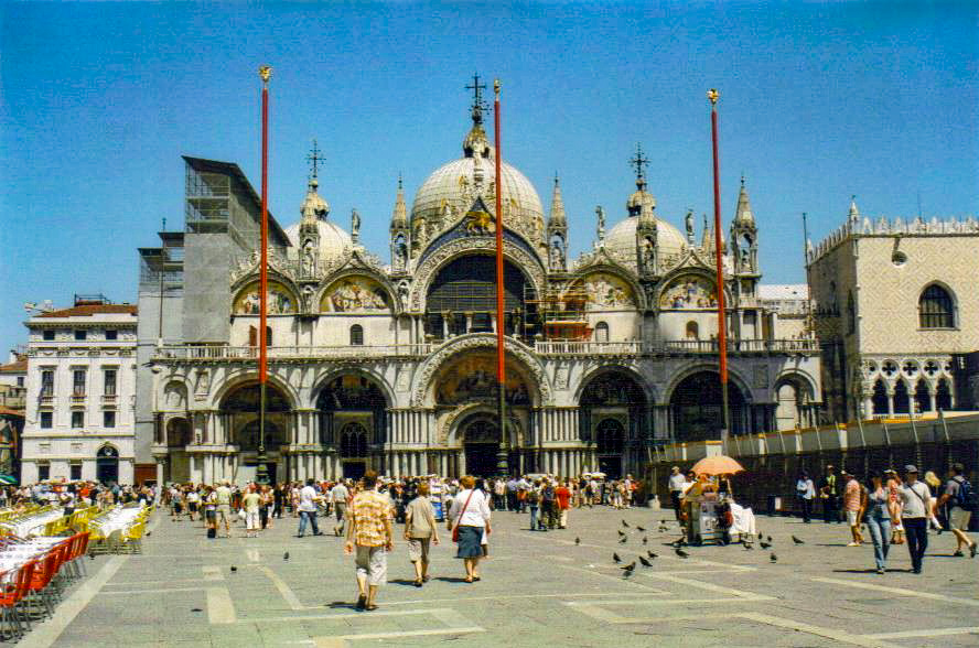 Inside, I stepped into the narthex and looked up at the spectacular narrative illustrated in one of the dome’s rotundas: the stories of Genesis and Exodus, with special emphasis on Adam and Eve, the Tower of Babel, Noah’s Ark, and a trio of early Bible figures—Abraham, Joseph, and Moses. Passing into the overwhelming main body of the church, I knew immediately that one can easily spend months here in order to see every detail. I was captivated by 500 columns, and the bronze and silver crucifix and statues of St. Mark, the Virgin Mary, and the Twelve Apostles atop the Gothic altar screen, from 1394, formed by eight columns of different marbles. The floor is a marble and mosaic carpet, with geometric designs and a circus of peacocks, lions, dogs, deer, and other animals.
