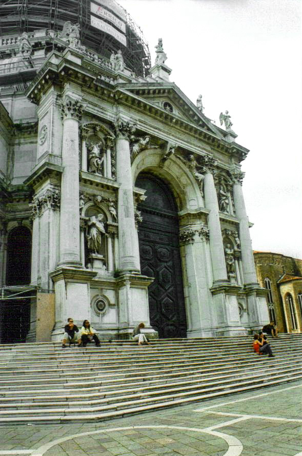 The octagonal Baroque church is one of Venice’s most recognizable buildings, its two beautiful domes and bell towers essential elements of the city’s skyline. Constructed on a platform made of one million wooden piles, the church is a spectacular display of Istrian stone and marmorino (brick covered with marble dust). I climbed the broad staircase that leads up to the main entrance, with the Virgin Mary standing at the apex of the front pediment and presiding over the church. I noted the gorgeous spiral volutes and tried to identify the 125 statues of the four evangelists, prophets, and saints adorning the facade.