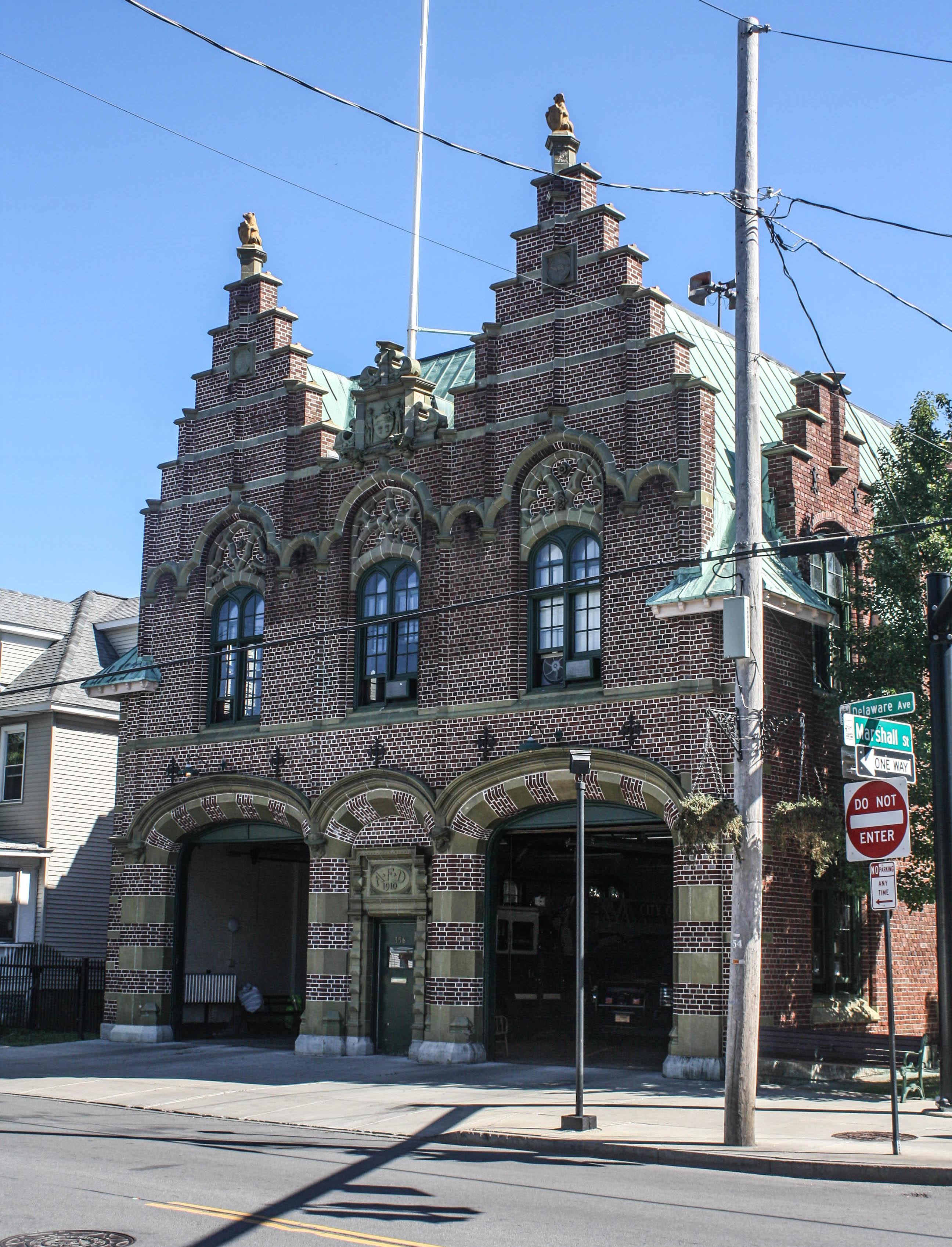 The greatest concentration of historic buildings in Brooklyn, New York, can be found in the downtown neighborhood, just feet from my apartment. And one of the most intriguing, and handsome, is the Old Brooklyn Fire Headquarters. Just like Manhattan’s Engine Company 31, this firehouse was made a New York City Landmark in 1966 and added to the National Register of Historic Places in 1972, and it, too, was vacated by the Fire Department in the 1970s. The Richardsonian Romanesque Revival fire station, built in 1892 by 31-year-old architect Frank Freeman, is now 18 residential apartments. Presently overwhelmed by bigger neighbors, it’s hard to imagine that the seven-story lookout tower once had sweeping views of the borough. The tower and its adjacent five-story section were constructed with orange brick, embellished by terra cotta detailing and vegetal keystones. Lovely turrets crowned with conical roofs rise up the façade, and both sections are topped by pyramidal red-tiled roofs trimmed with copper. On the ground floor, a bold, broad arch of red sandstone, carved with flamboyant vinelike details, harkens back to when fire engines passed through this entrance.#4 Hook & Ladder #4 (Albany, New York)
