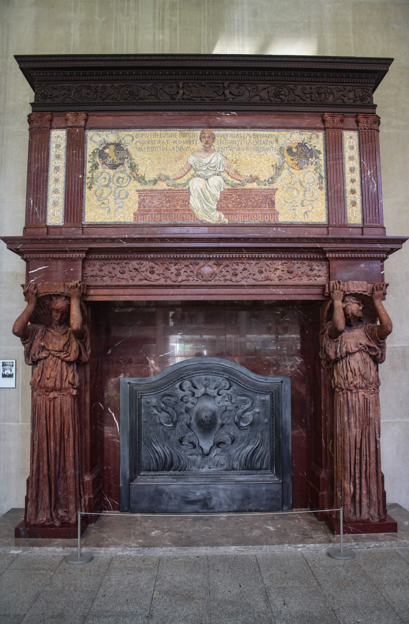 New York’s Metropolitan Museum of Art, the largest art museum in the United States, occupies a two-million-square-foot neo-classical building along the eastern edge of Central Park. It houses more than two million objects, masterpieces of art of all kinds of media. In the American Wing, I found one of them, the Vanderbilt Fireplace. Originally dominating the entrance hall of Cornelius Vanderbilt II’s mansion, it found its way about 25 blocks north when it was donated to the museum by his wife in 1925, just before the mansion was tragically demolished. Famed American sculptor Augustus Saint-Gaudens created this piece in 1883. On either side of the marble and cast-iron fireback stand caryatids with bowed heads, uplifted arms, and richly textured gowns. The left lady, her waist encircled by ivy leaves, represents Love (“Amor” is inscribed above her); on the right, the female statue, with a girdle of laurel, stands for Peace (topped with the inscription “Pax”). In the mosaic overmantel, flanked by fluted Corinthian pilasters, a classically dressed woman holds garlands, and Latin inscriptions translate as a welcome wish and an expression of farewell. In the center of the oak entablature at the top you’ll find a simple V. Measuring about 15’ high, nearly 13’ wide, and approximately three feet deep, this fireplace is a prime example of the unimaginable wealth of New York’s Gilded Age.