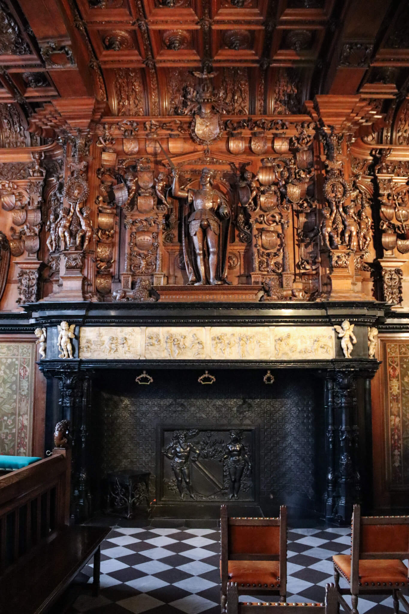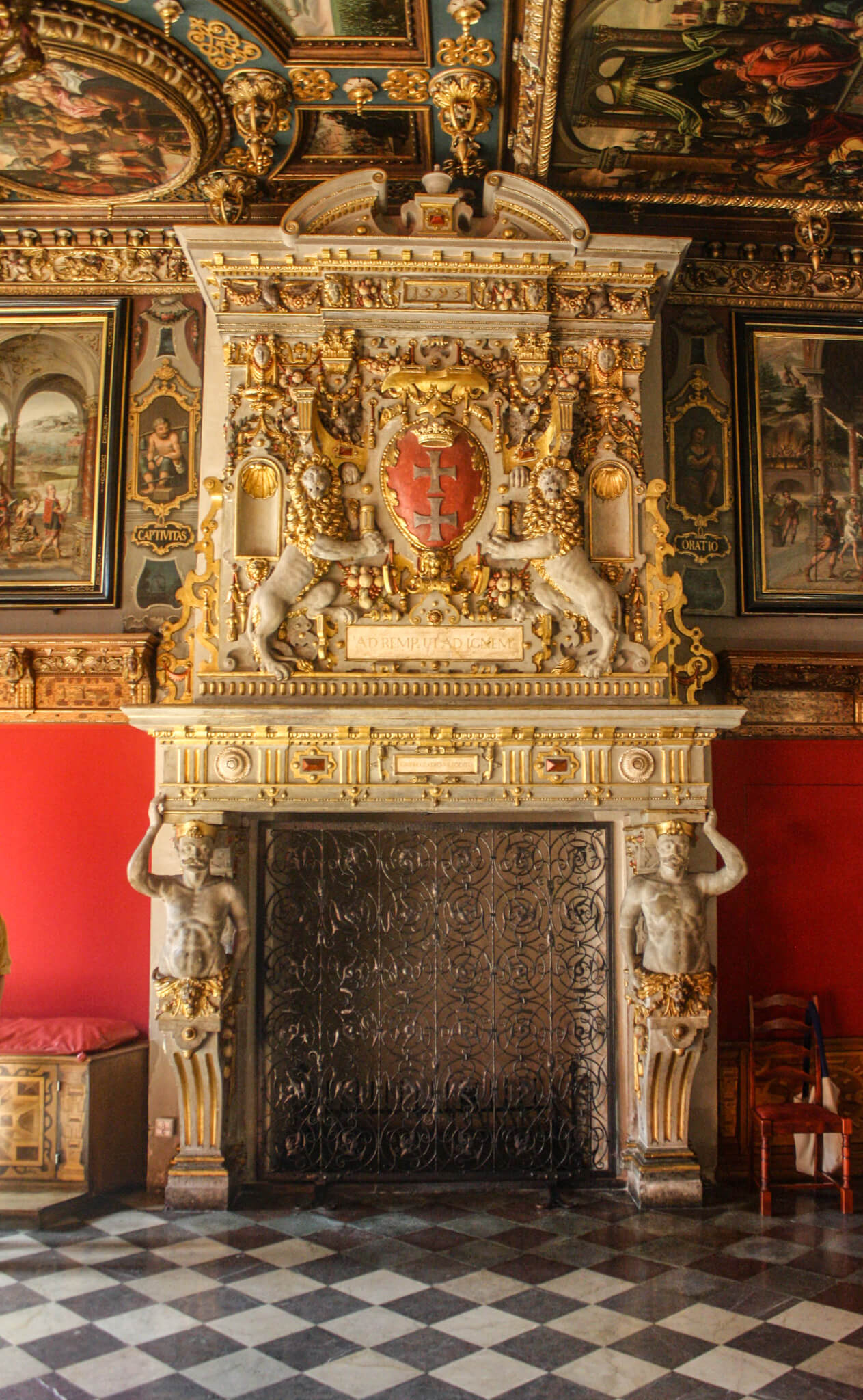 Along the Royal Way, the glorious heart of Gdansk that was decimated during World War II and spectacularly rebuilt afterward in the style of what had been there before the destruction, I visited the Historical Museum of Gdansk, housed in the Main Town Hall, completed in the 1400s as the seat of city authorities. In the highly ornamented Red Room, which houses a stunning ceiling covered in paintings and encrusted frames, as well as one of the world’s best depictions of hell, I found this striking fireplace. On either side of the black filigree fireplace screen stands a bare-chested atlantid holding up the corbel with his head and one arm. The overmantel is dominated by Gdansk’s grand coat of arms: a golden crown hovering above two silver crosses on top of each other, all on a red shield, and everything held up by a pair of lions. Created in 1593 (look for the year at the top of the overmantel, just below the broken pediment with the little urn), this masterpiece is awash in gilded stucco sea shells, faces, garlands, birds, and fruits, totally befitting the opulent room in which it stands.