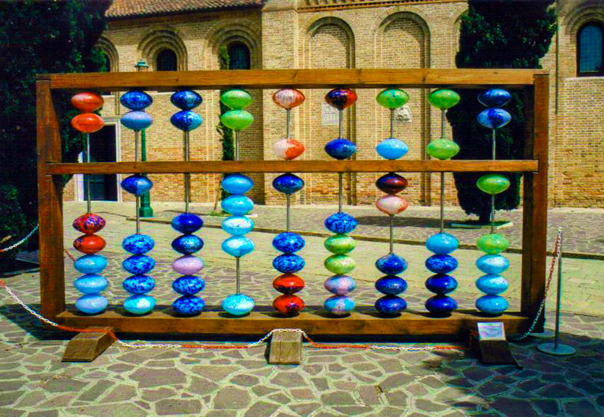 East met West in the most delightful manner when I stumbled upon the playful Abacus, Western Zhou Dynasty, 1046–771 BC next to the Basilica of Saint Mary and Saint Donatus on one of the islands of Murano in Venice, where it was unveiled in 2007. Abacus juxtaposes an ancient Chinese calculator with the centuries’-old glassmaking tradition in Murano. The artist, Shanghai-born Shan Shan Sheng, worked with master glassblowers in Murano to create her piece. Its larger-than-life size, at 15’ wide and 8’ high, gives it a playful air while also letting the viewer explore and appreciate color and material. Within the wood frame, red, blue, and green Murano handblown glass spheres stack up on stainless steel rods. The spheres are marked by ethereal streaks and speckles, revealing handmade craft and lines that emphasize the talents and originality of Murano glassmakers. It’s also instructive in math, but I think I failed the test. I very much wanted the arrangement to reflect the dates in the title, 1046–771, but all I could do was come close with 10,465,751.