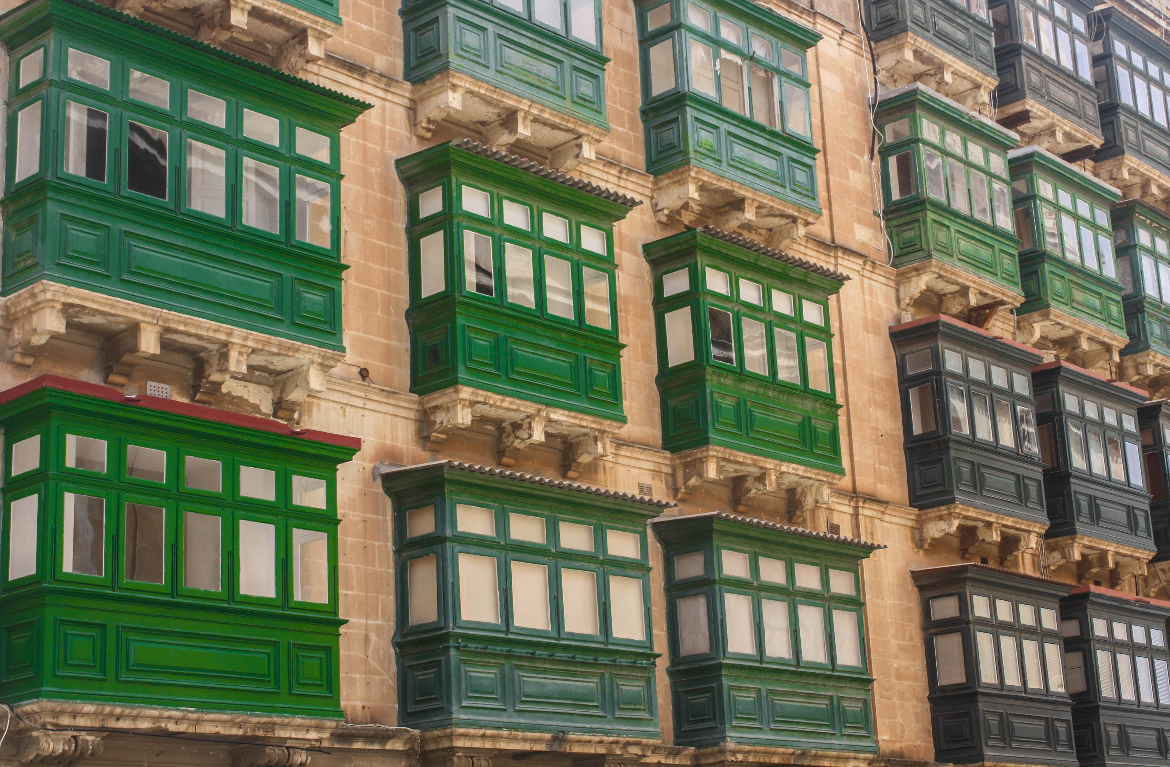 I exited the Hotel Phoenicia, my wonderful accommodations in Floriana, and walked for all of one minute before entering Valletta, the Maltese capital. The first thing I noticed was the monochromatic color of all the sandstone buildings, soft beiges and buffs, handy in reflecting blistering hot summer sunshine and handsomely washing Valletta in a uniform hue. With that as the background, the colorful wooden balconies that I saw absolutely everywhere really come to life, and the green balconies were my favorite. Although all of them are beautiful, the red and the purple ones seemed too bold, the cream and the yellow ones blended into the buildings too much, and the blue ones presented too much of a contrast. The green ones, however, struck the perfect balance. These small-scale closed wooden balconies began to show up in the 1700s and quickly grew in popularity, filtering down from the ruling class to the affluent and then the less affluent classes. Arabic in origin (no surprise here; the Arabs were one of many peoples who made their mark on this island nation, smack in the middle of the Mediterranean), these ubiquitous balconies protrude from buildings throughout the city, resting on stone brackets. A row of sealed windows runs across the top and sides, a row of larger functional windows spans the center section on all three sides, and a row of wood panels anchors the bottom. This design allowed Arabic women to be able to look at the world outside their homes yet retain the prescribed modesty and remain out of the eyesight of men. Of course, their visual appeal attracted non-Arabs, who adopted the structure as their own, expanding the function over the centuries. These practical extensions bring fresh air and natural light inside the home, and the extra floor space provides an area for, perhaps, drying laundry or growing plants à la a small conservatory. True to their original purpose, they still provide an observation point for residents to watch the world, and their neighbors, go by, but women today often lean outside to see what’s going on rather than remaining hidden behind the glass. And, thanks to Valletta’s undulating streets, I was able to view them from all vantage points, whether I was standing below one at the base of a building, or looking at third- or fourth-floor balconies at eye level when I was halfway up one of the city’s steep streets, or gazing down at them from the top of a hill.