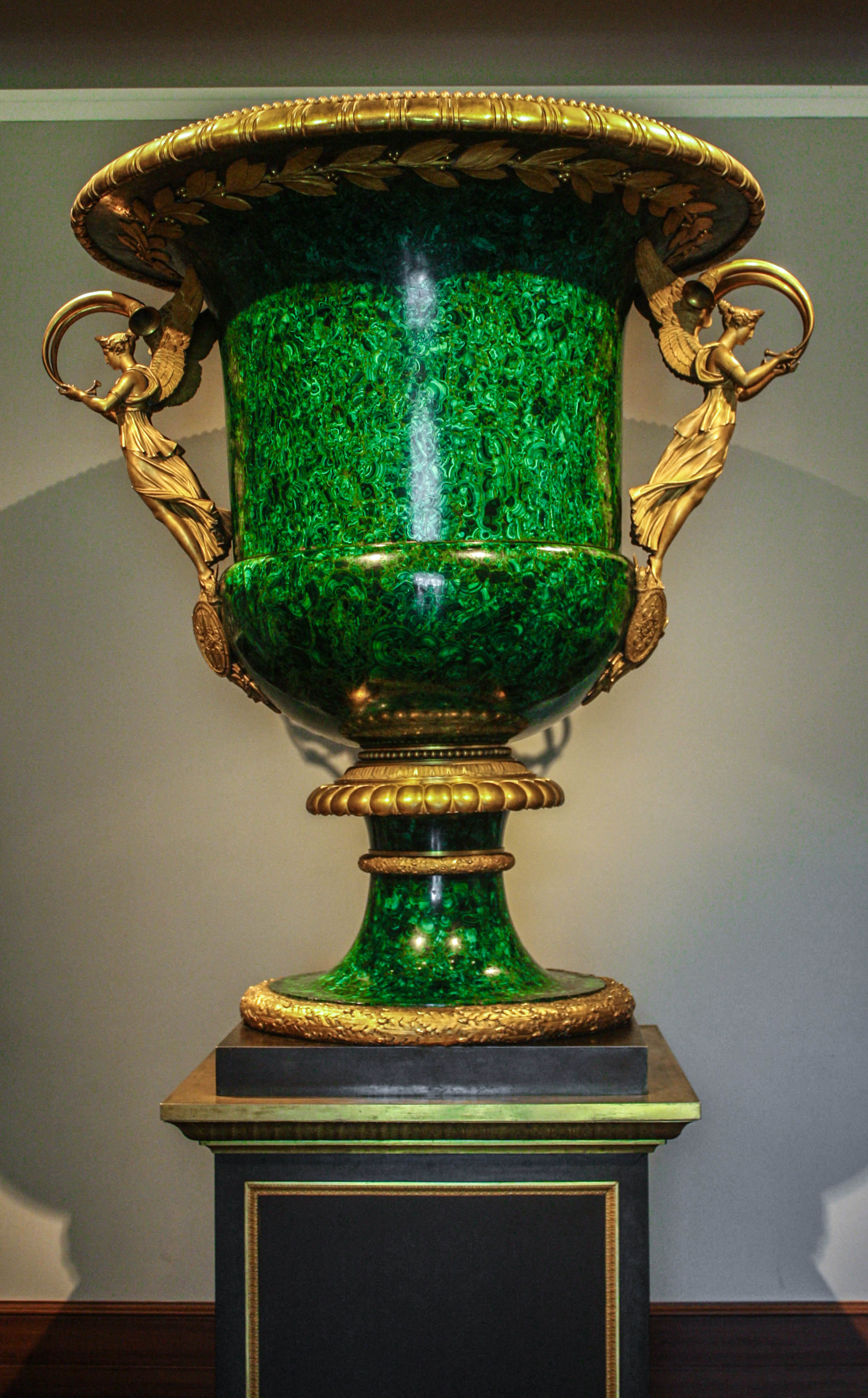 Malachite shows up again, here at the Metropolitan Museum of Art in New York City. The largest museum in the United States boasts an enormous collection of unforgettable art, and one of its many pieces that will grab your attention is the gorgeous Monumental Vase, housed in the European Sculpture and Decorative Arts section. Created around 1814, this highly polished bright-green malachite vase made its way from its origins in Russia to a Florentine villa to the Vanderbilt family in New York, eventually landing at the museum when Mrs. Cornelius Vanderbilt sold it in 1944. The vase stands more than five feet tall, with a circumference at the top of more than four feet. Although it looks as if it were fashioned from one piece of malachite, that’s not the case. Malachite’s brittle structure precludes it from lending itself to large objects, like this one. Rather, a core structure is fashioned with thin pieces attached to it. Talented Russian craftsmen were able to combine malachite’s natural pattern with an exacting cutting technique to give larger objects an almost seamless appearance. The striking pattern resembles what you might see if you observed algae under a microscope, swirls of beautiful deep green that almost seem to billow before your eyes. A gilded bronze garland of laurel encircles the vase under the lip mount, suggesting Victory. Mounted on both sides of the vase, winged female figures in gilded bronze, standing atop a headless torso of a solider bearing a shield, represent Fame. They hold trumpets, hinting at an announcement of great import, that are shaped like handles. Despite all its allusions to winning, no human would ever be able to lift it in triumph—the vase, including its pedestal, weighs almost 1,600 lbs.