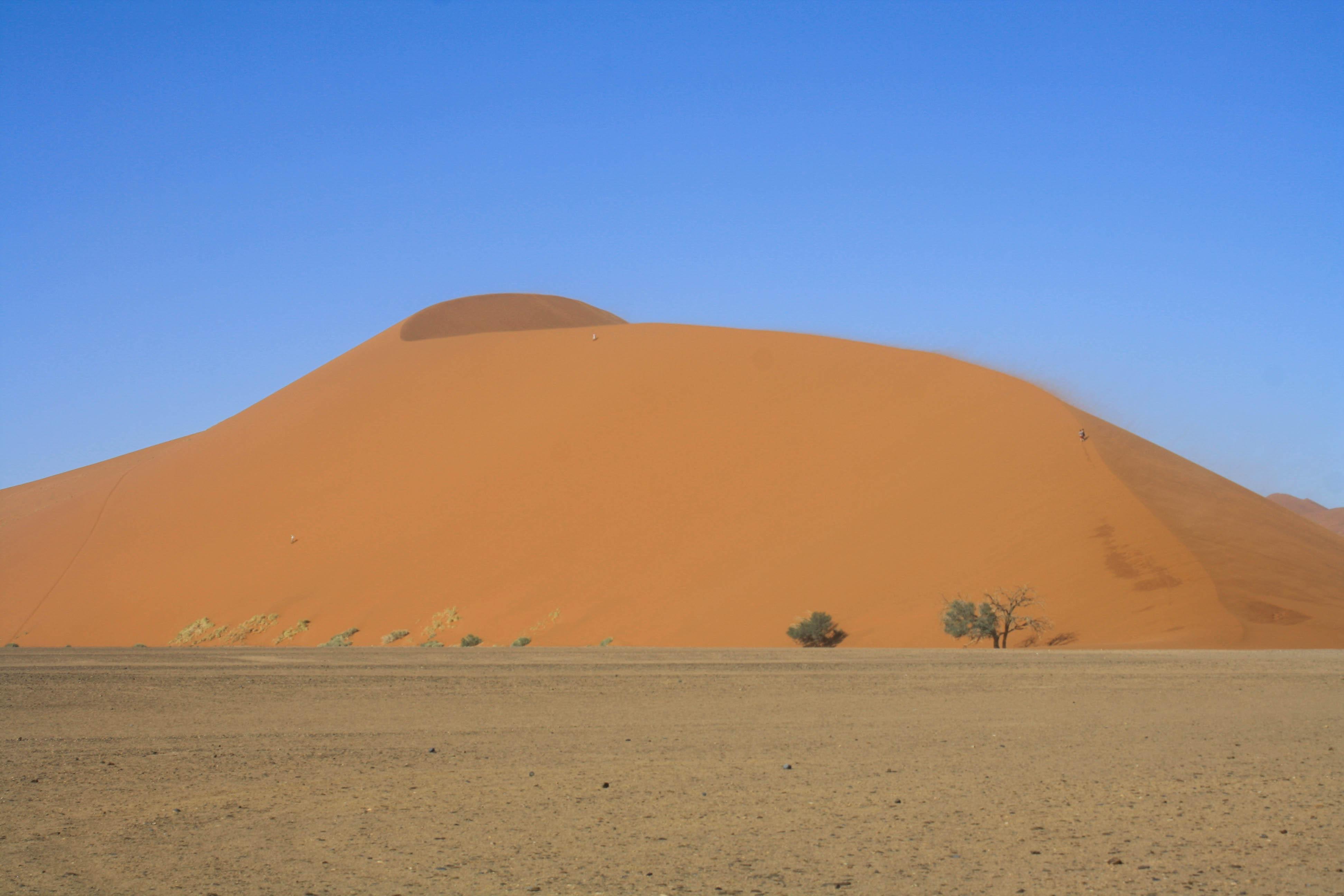The vast Namib Desert covers more than 31,000 square miles along the coast of southwestern Africa. Concentrated mostly in Namibia, it’s the world’s oldest desert (at least 55 million years old) and one of the world’s driest regions, registering less than one-tenth of an inch of rain annually in its most arid areas. Within the desert, Namib-Naukluft National Park attracts a fair share of attention: It’s the largest game park in Africa, and it boasts the world’s largest sand dunes in the Sossusvlei area. These soaring dunes stretch for 20 miles and can reach up to almost 1,000′, and their brilliant orange color, especially against a cloudless blue sky backdrop, is positively stunning, particularly at sunrise and sunset. Their orange color stems from the oxidization of iron in the sand, like rusting metal: Older dunes sport brighter color. The superstar of the dunes is Dune 45, named for its position at the 45th kilometer mark on the road from the Sesriem gate to Sossusvlei. Its distinctive form and ease of accessibility, and the lure of a 500′ climb to the top that gets progressively more difficult, make it a popular spot to appreciate these natural phenomena. And if you’re here on a windy day—a frequent weather condition—you’ll clearly see the sand being blown off the peaks of the dunes.