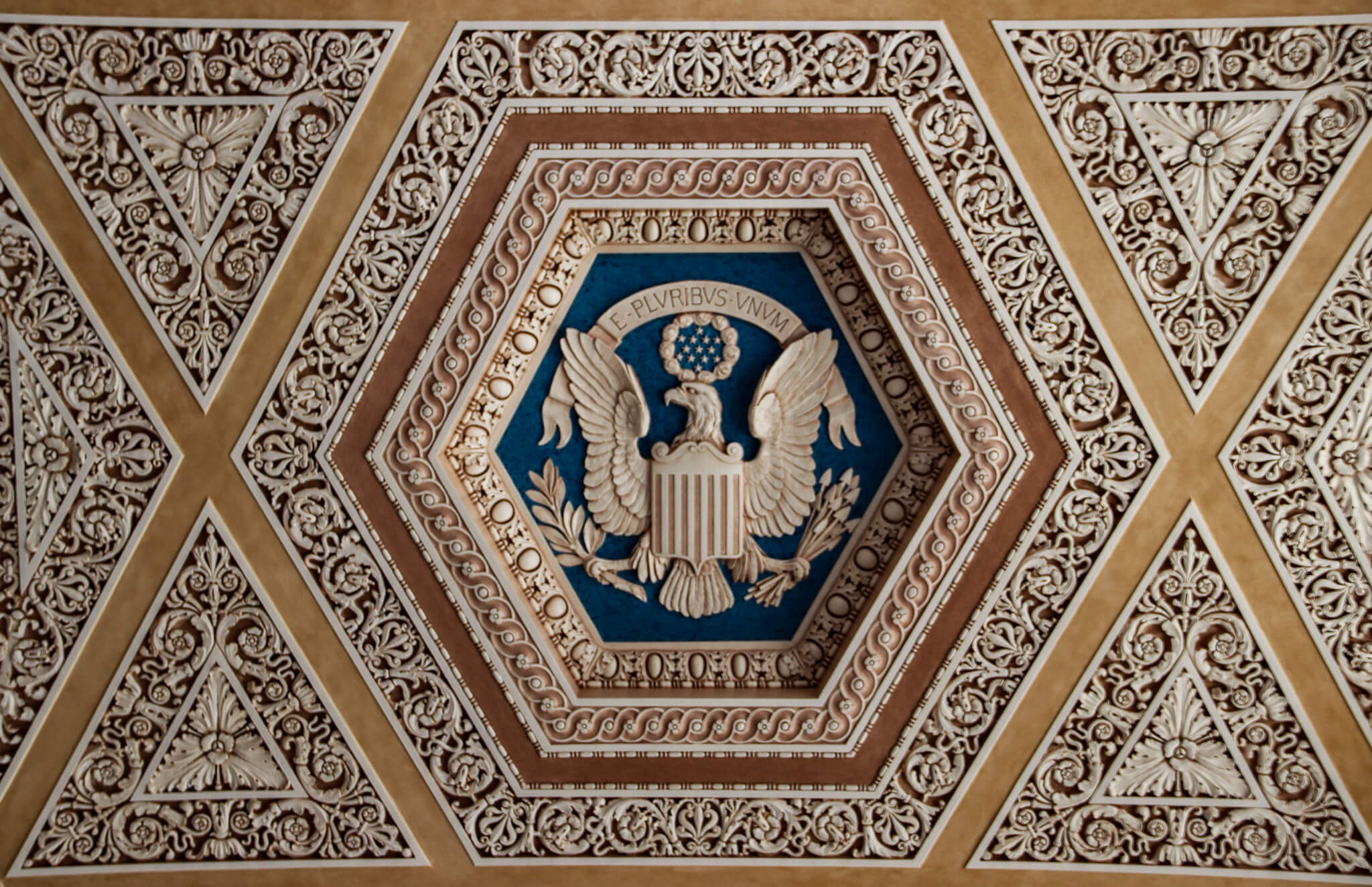 The massive Old General Post Office, now named the James A. Farley Post Office, after the American politician and postmaster general under President Franklin D. Roosevelt, occupies two full city blocks in the heart of Manhattan. The building was designed in the Beaux-Arts style by the legendary architectural firm McKim, Mead & White. A flight of 31 stairs, stretching across the entire width of the building save for the two square pavilions at the end, leads up to the largest Corinthian colonnade in the world. Twenty columns support an entablature that bears the creed of the United States Postal Service: “Neither snow nor rain nor heat nor gloom of night…” (which actually originated in ancient Persia, more than 2,000 years ago). Inside, ongoing rehabilitation and reuse have created a much more welcoming arrival to New York City with a new head house for Penn Station and a shopping arcade. But it’s the still-functioning post office section that captivated me. The southern pavilion contains a WPA mural of the Triboro Bridge during construction, while the northern pavilion bears another WPA mural, of the city’s skyline and waterfront traffic, as well as several bronze World War II honors roll plaques. Linking the two pavilions, the front reception hall and its painted plaster ceiling will command your attention while you’re buying stamps or sending a package. Divided into 10 sections measuring 28’ each, the elaborately carved ceiling features the national emblems or coats of arms of the 10 members of the Universal Postal Union at the time of the building’s construction, from 1911 to 1914, including the Kingdom of Italy, the Russian Empire, Austria-Hungary, and the bald eagle, 13 stars, arrows, olive branch, and shield of the United States.