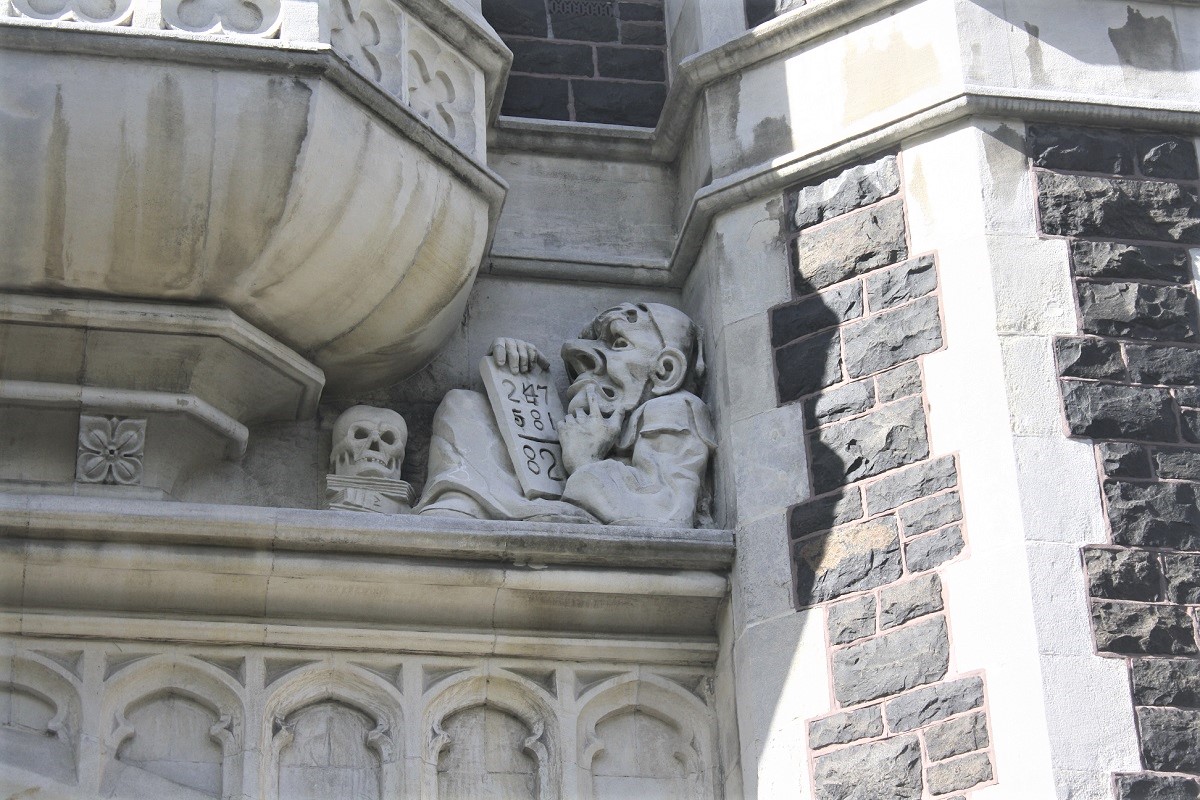 Opened in 1871 with just three professors (one for classics and English language and literature; one for mental and moral philosophy and political economy; and one for mathematics and natural philosophy), the University of Otago in Dunedin, New Zealand (a city that also has one of the world’s most beautiful train stations and one of its top 10 benches) has grown tremendously over the years. Its campus houses some gorgeous Gothic-style bluestone buildings with Oamaru stone facings. One of them, the Archway, built in 1914 as the formal entrance to the university, sports an ornamental feature that would make that third professor—and you—chuckle. While the architect stayed true to the style of the original Clocktower building when designing the Archway, he also decided to have a little fun by adding a series of grotesques to the façade—decorative and fanciful human and animal forms, distorted to be ugly or absurd. The stonemason created eight small figures toward the top and two larger ones directly above the arch. While the one on the left is quite good—a scholar holding a globe and pointing to New Zealand, accompanied by an owl perched atop a lamp (both symbols of wisdom)—it’s the one on the right that gets the big laugh. A scholar with exaggerated ears and nostrils tucked into the corner and wearing a night cap also wears a very nervous expression on his face. Next to him, a skull (representing mortality) sits on a pile of books (symbols of learning, obviously; and one etched volume IV). But he’s more concerned with the task at hand. He holds a slate with a mathematical problem that he may or may not have gotten right. When he adds 247 and 581, he comes up with a sum of what could be the correct 828, but the right digit is obscured by his hand. Did he pass or fail? We’ll never know, and it’s this bit of architectural folly that will put a smile on your face.