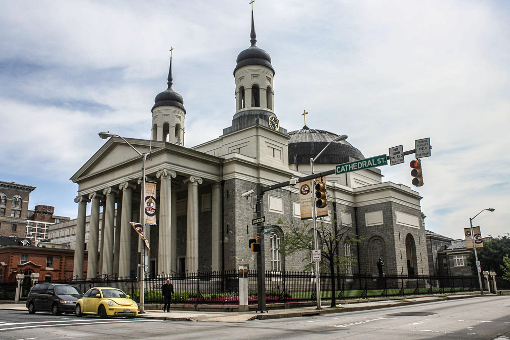 Located atop a hill above Baltimore Harbor, the Basilica of the National Shrine of the Assumption of the Blessed Virgin Mary (more handily called the Baltimore Basilica) is a major magnet for all kinds of people: Catholics, architects, historians, or anyone who just enjoys a gorgeous building. Completed in 1821 as the first Roman Catholic cathedral constructed in the United States and the country’s first archdiocese (from which two-thirds of U.S. Catholic dioceses can trace their heritage), it was promoted to a minor basilica in 1937, listed on the National Register of Historic Places in 1969, declared a National Historic Landmark in 1971, and designated a National Shrine in 1993. The handsome silver-gray gneiss façade features a pair of cylindrical towers and a wooden double-shell dome. I passed under the Greek portico with fluted Ionic columns and entered the neo-classical building, following in the path of such illustrious figures as Ralph Waldo Emerson, Andrew Johnson, Mother Teresa, Alexis de Tocqueville, Pope John Paul II, and the Marquis de Lafayette. The simple, very bright, elegant, and understated interior represents the architect’s and diocese’s vision to not have it resemble its grander European predecessors. Against cream-colored walls, the Four Evangelists get a symbolic treatment on fields of a striking blue. Small, saucer-shaped secondary domes surround the tremendous main dome, with a white dove against a gold background in the oculus and its ceiling accented by plaster rosettes in coffered medallions and panels. Make sure to head downstairs to visit the chapel and the quiet crypts that contain the remains of the first bishop of the United States. You’ll definitely want to see the fantastic brickwork of the arches and herringbone-pattern floor.